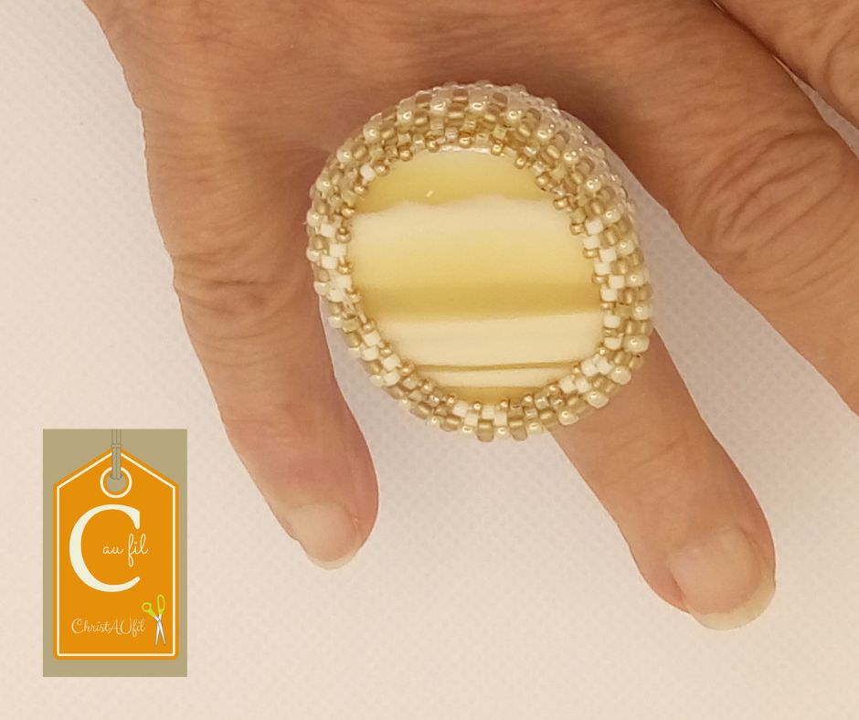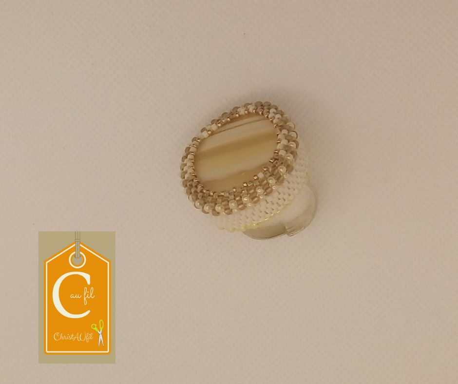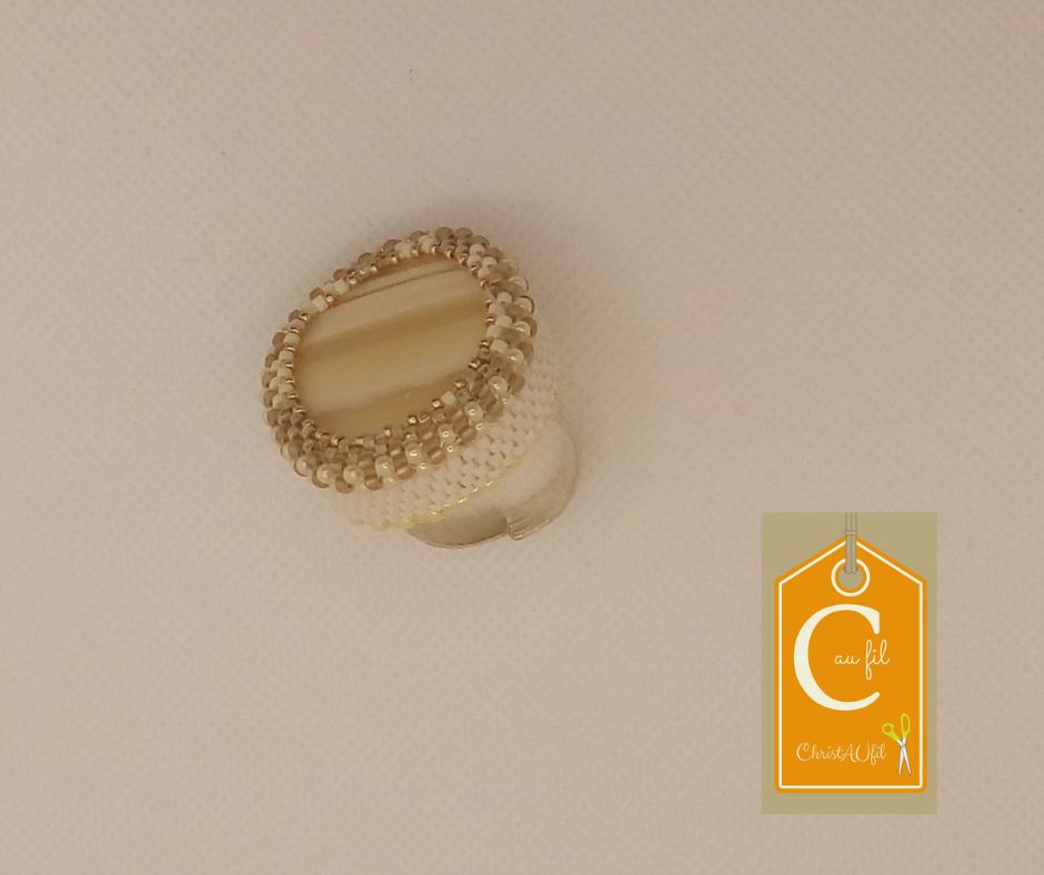 Bouton ref 21037 blanc et beige. Dimensions 3,2 cm x 3,8 cm serti de perles japonaises blanches et beiges et jaunes sur le dessous. L’anneau argenté (sans nickel) est ajustable.