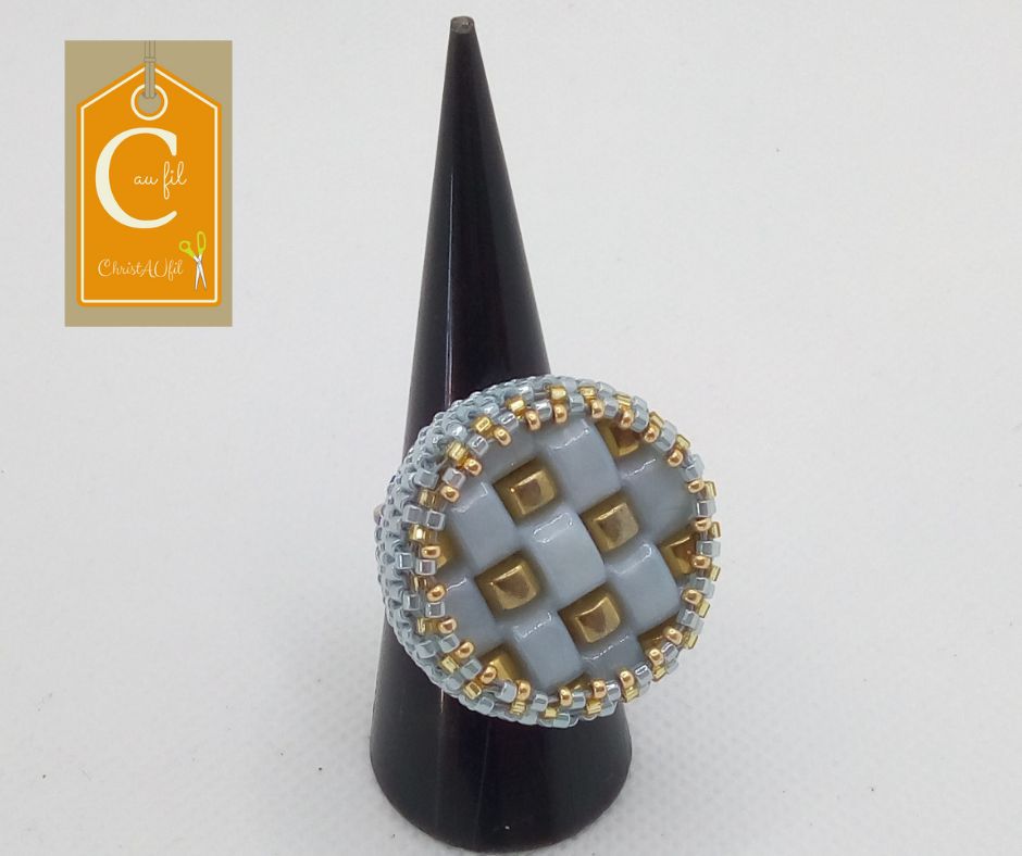 Bouton ref 23045 bleu ciel avec un motif de carrés or incrustés. Diamètre 2,7 cm serti de perles japonaises irisées bleues et dorées. L’anneau bronze (sans nickel) est ajustable.