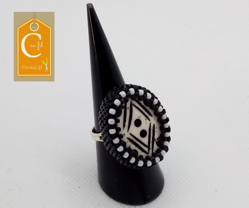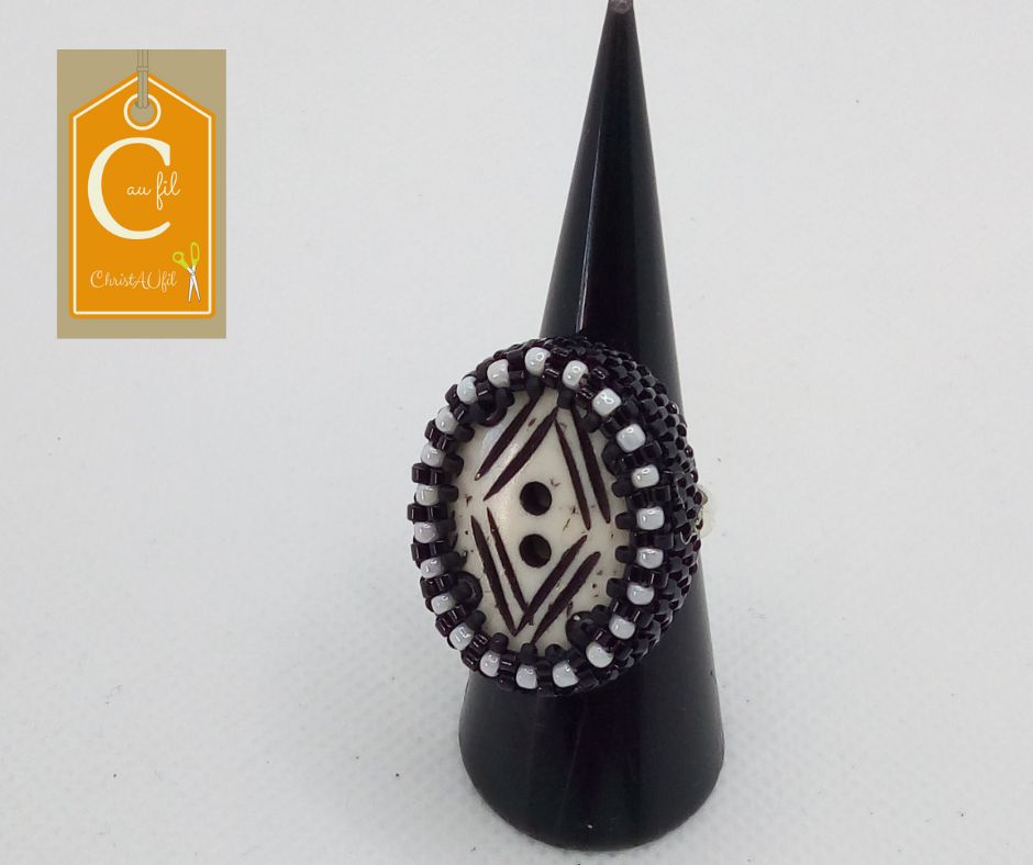 Bouton ovale ref 22044 noir et blanc. Dimensions 2,2 cm x 2,8 cm serti de perles japonaises noires et blanches. L’anneau argenté (sans nickel) est ajustable.