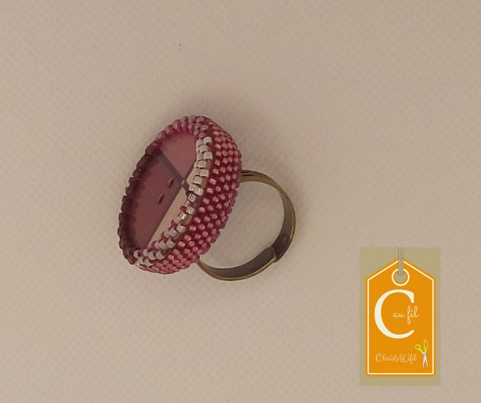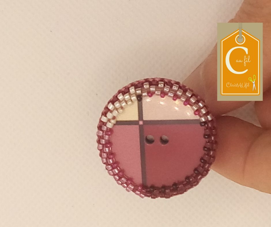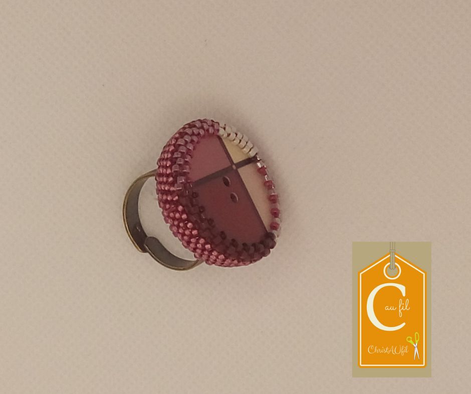 Bouton vintage ref 24036 couleur mauve, framboise, crème, à carreaux. Diamètre 3 cm serti de perles japonaises roses, argentées, beiges. L’anneau bronze (sans nickel) est ajustable.
