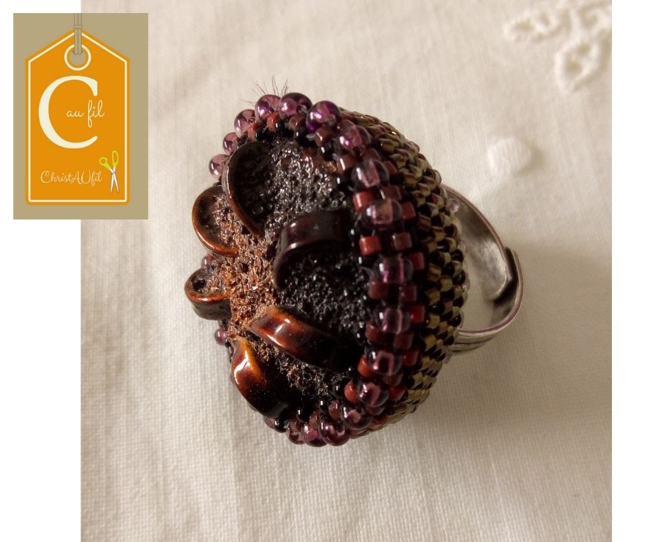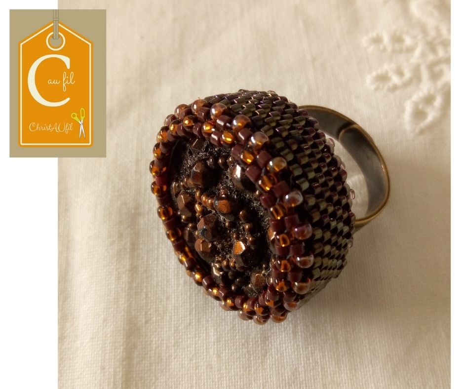 Bouton ref 23001 brun avec irisations et reliefs mordorés. Diamètre 3 cm serti de perles japonaises irisées brunes rehaussées de perles dorées. L’anneau bronze est ajustable.