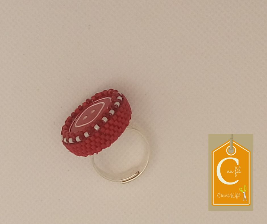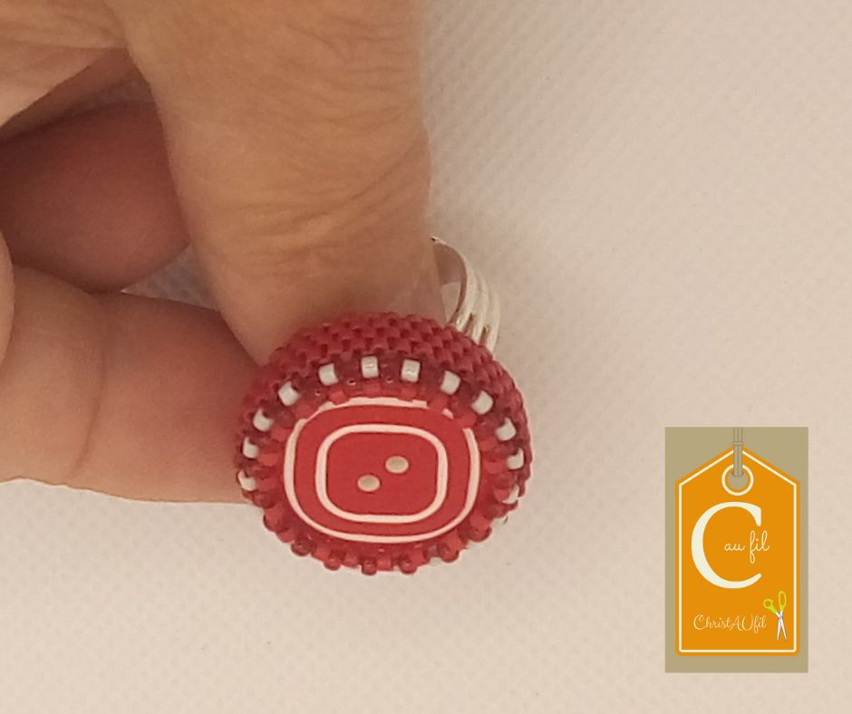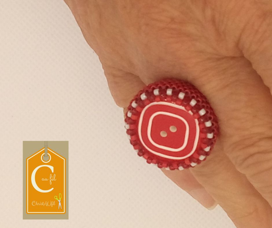 Bouton 2 trous ref 24041 rouge avec 2 losanges blancs. Diamètre 2,5 cm serti de perles japonaises rouges et blanches. L’anneau argenté (sans nickel) est ajustable.