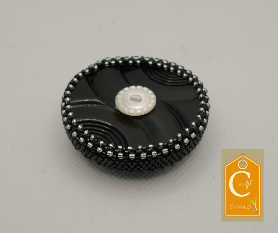 Bouton ref 52079 ancien, noir avec un petit bouton blanc au centre. Diamètre du bouton 4,8 cm serti de perles japonaises noires et métalliques. Cette broche entièrement réalisée à la main permet de fermer votre veste ou gilet ou encore une écharpe même épaisse sans percer votre vêtement grâce à un aimant néodyme placé à l’arrière.