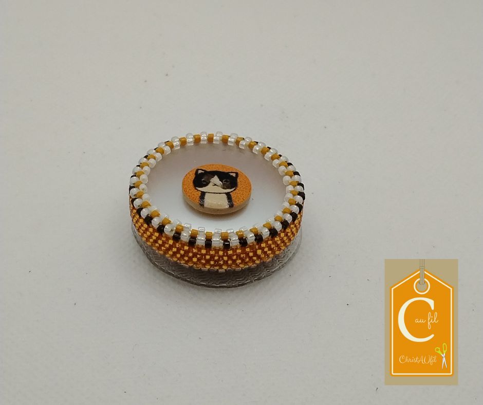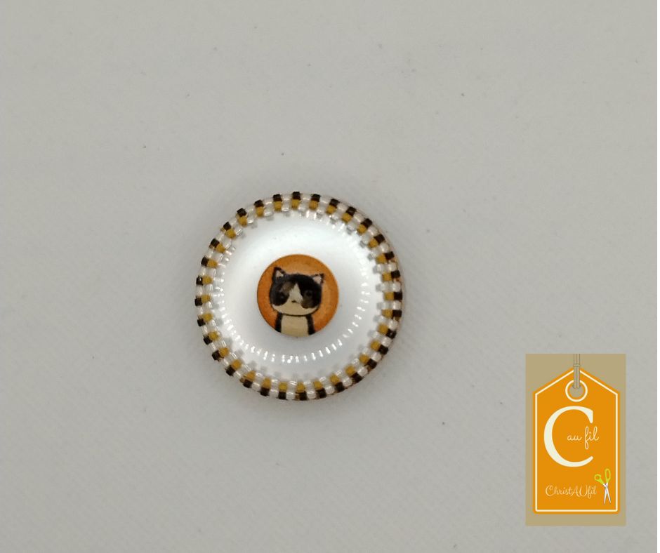 Bouton ref 51086 blanc avec au centre un petit bouton représentant un chat. Diamètre du bouton 3,6 cm serti de perles japonaises dorées, jaunes, blanches et noires. Cette broche entièrement réalisée à la main permet de fermer votre veste ou gilet ou encore une écharpe même épaisse sans percer votre vêtement grâce à un aimant néodyme placé à l’arrière.