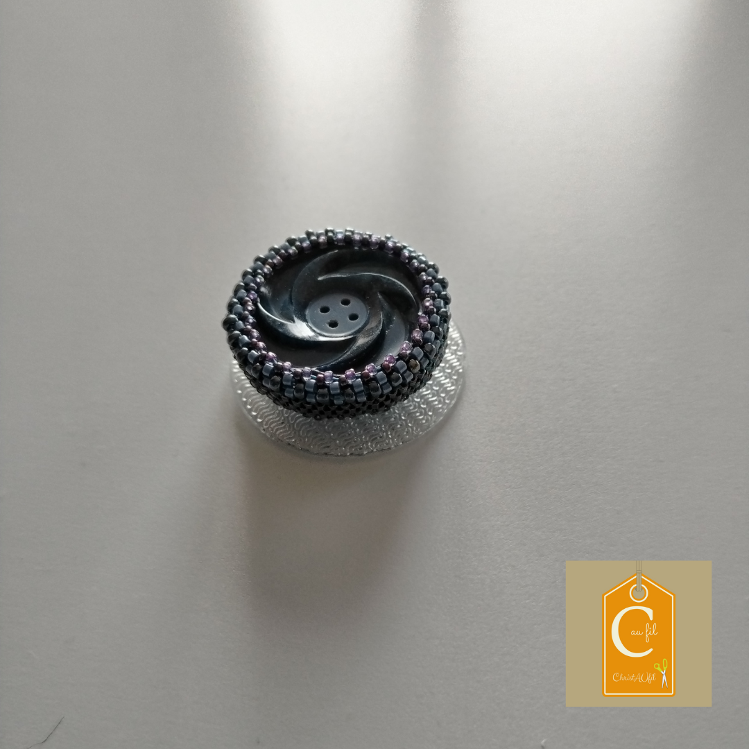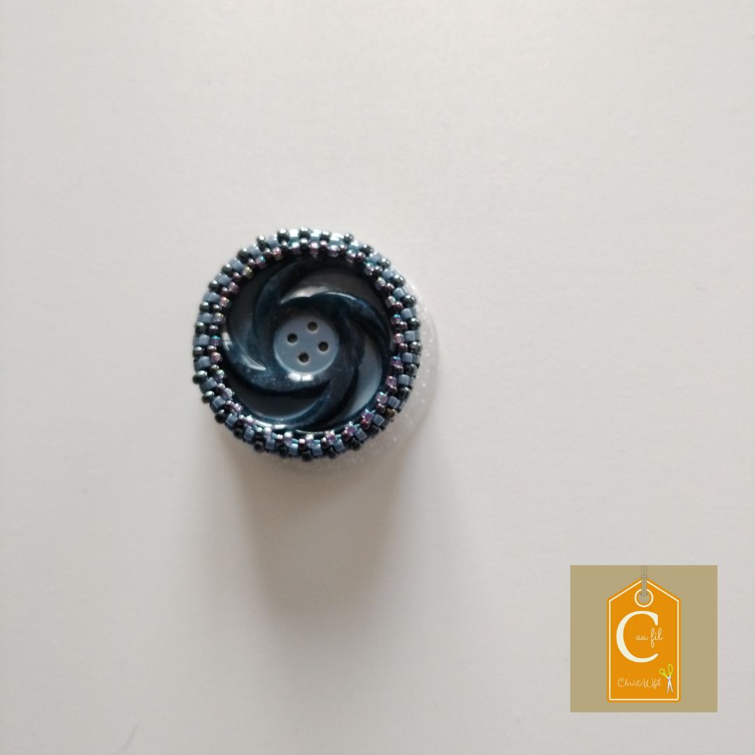 Bouton ref 55085 bleu avec 4 trous au centre. Diamètre du bouton 3,4 cm serti de perles japonaises irisées bleues. Cette broche entièrement réalisée à la main permet de fermer votre veste ou gilet ou encore une écharpe même épaisse sans percer votre vêtement grâce à un aimant néodyme placé à l’arrière.