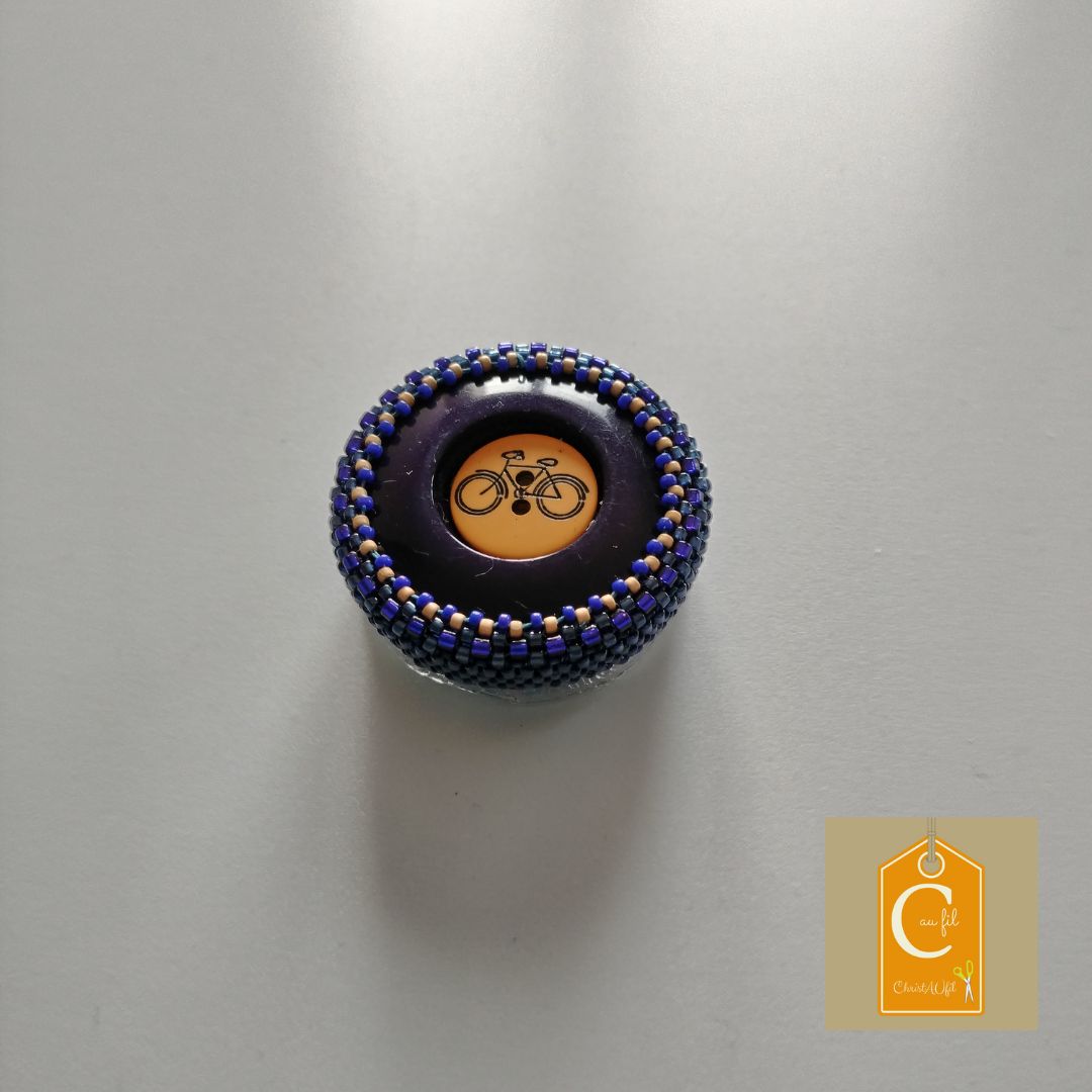 Bouton ref 55086 bleu-mauve avec au centre un bouton plus petit jaune représentant un vélo. Diamètre du bouton 3,8 cm serti de perles japonaises irisées bleues et jaunes. Cette broche entièrement réalisée à la main permet de fermer votre veste ou gilet ou encore une écharpe même épaisse sans percer votre vêtement grâce à un aimant néodyme placé à l’arrière.