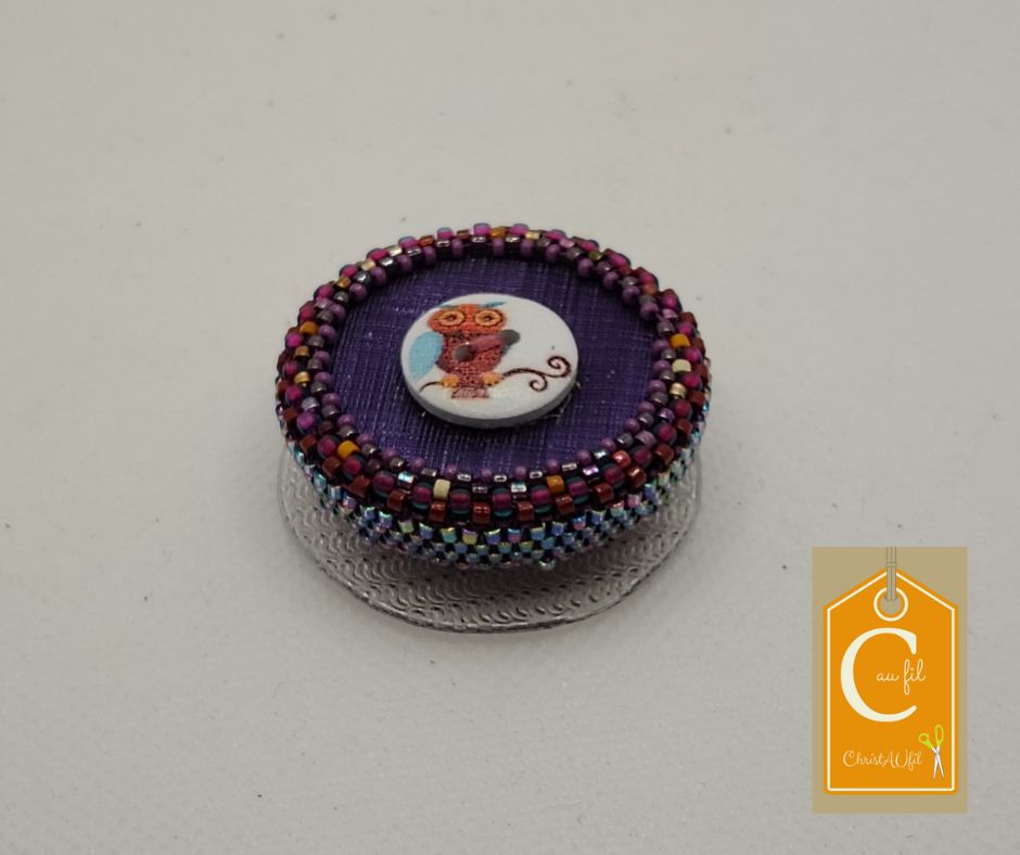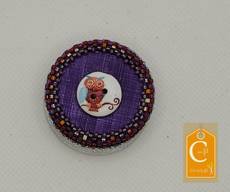 Bouton ref 54087 mauve avec au centre un petit bouton représentant un hibou sur une branche. Diamètre du bouton 3,6 cm serti de perles japonaises irisées mauves et quelques nuances jaunes. Cette broche entièrement réalisée à la main permet de fermer votre veste ou gilet ou encore une écharpe même épaisse sans percer votre vêtement grâce à un aimant néodyme placé à l’arrière.