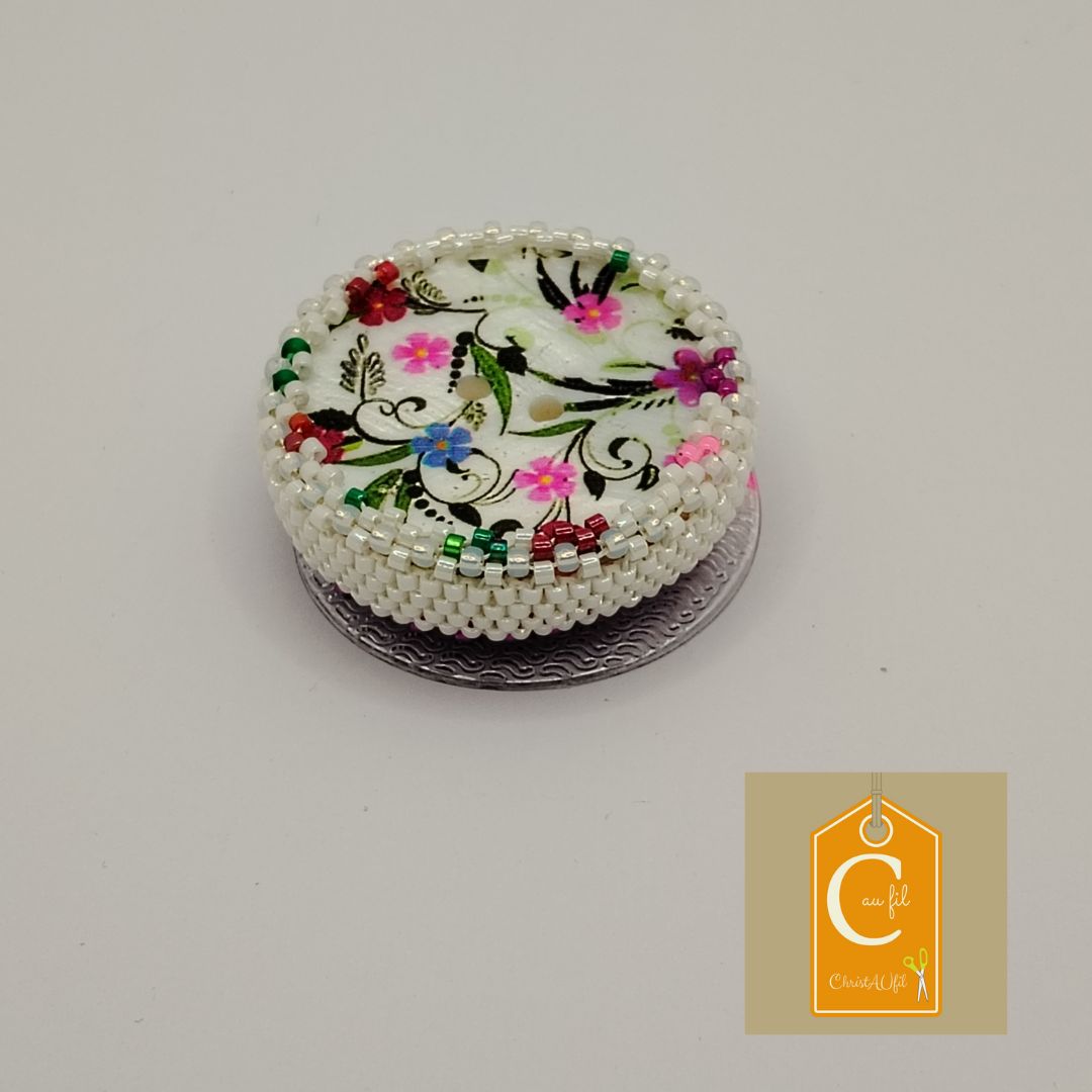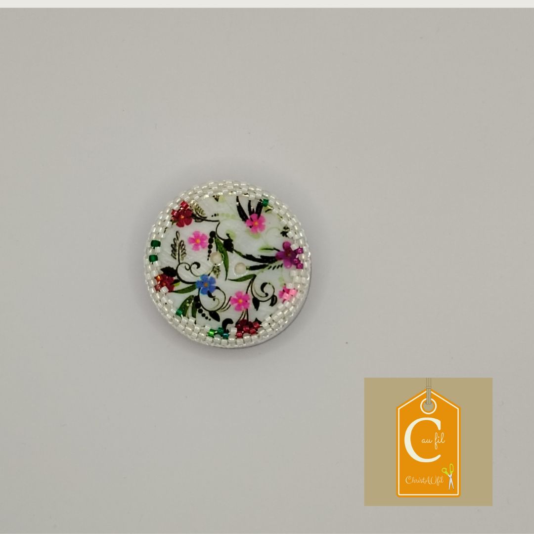 Bouton ref 51099 en nacre avec décor de fleurs sur fond blanc. Diamètre du bouton 3,6 cm serti de perles japonaises blanches avec quelques notes vertes, rouges, mauves, roses. Cette broche entièrement réalisée à la main permet de fermer votre veste ou gilet ou encore une écharpe même épaisse sans percer votre vêtement grâce à un aimant néodyme placé à l’arrière.