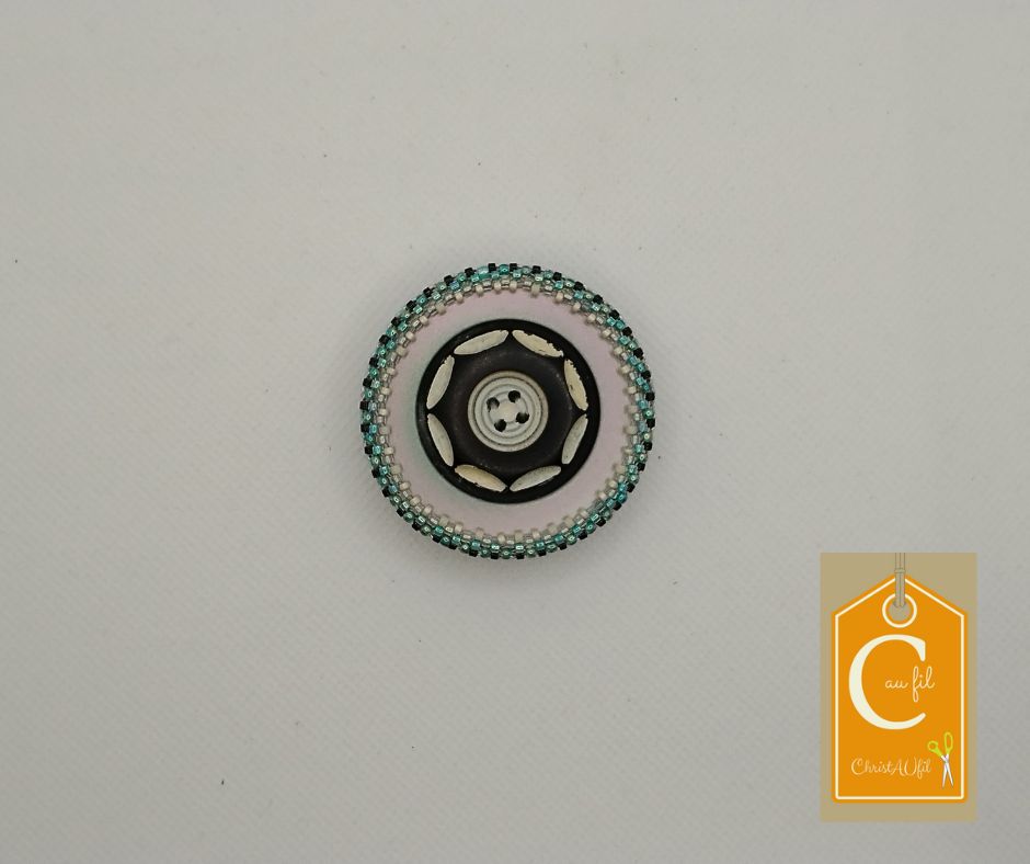 Bouton ref 53088 en nacre grise avec un bouton noir et blanc au centre. Diamètre du bouton 4,6 cm serti de perles japonaises turquoises, noires et blanches. Cette broche entièrement réalisée à la main permet de fermer votre veste ou gilet ou encore une écharpe même épaisse sans percer votre vêtement grâce à un aimant néodyme placé à l’arrière.