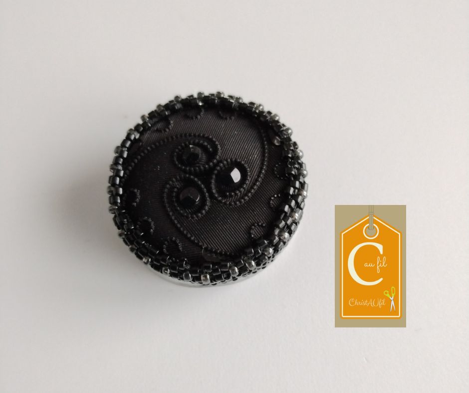 Bouton ref 52114 bouton noir esprit ancien. Diamètre du bouton 3,5 cm serti de perles japonaises noires. Cette broche entièrement réalisée à la main permet de fermer votre veste ou gilet ou encore une écharpe même épaisse sans percer votre vêtement grâce à un aimant néodyme placé à l’arrière.