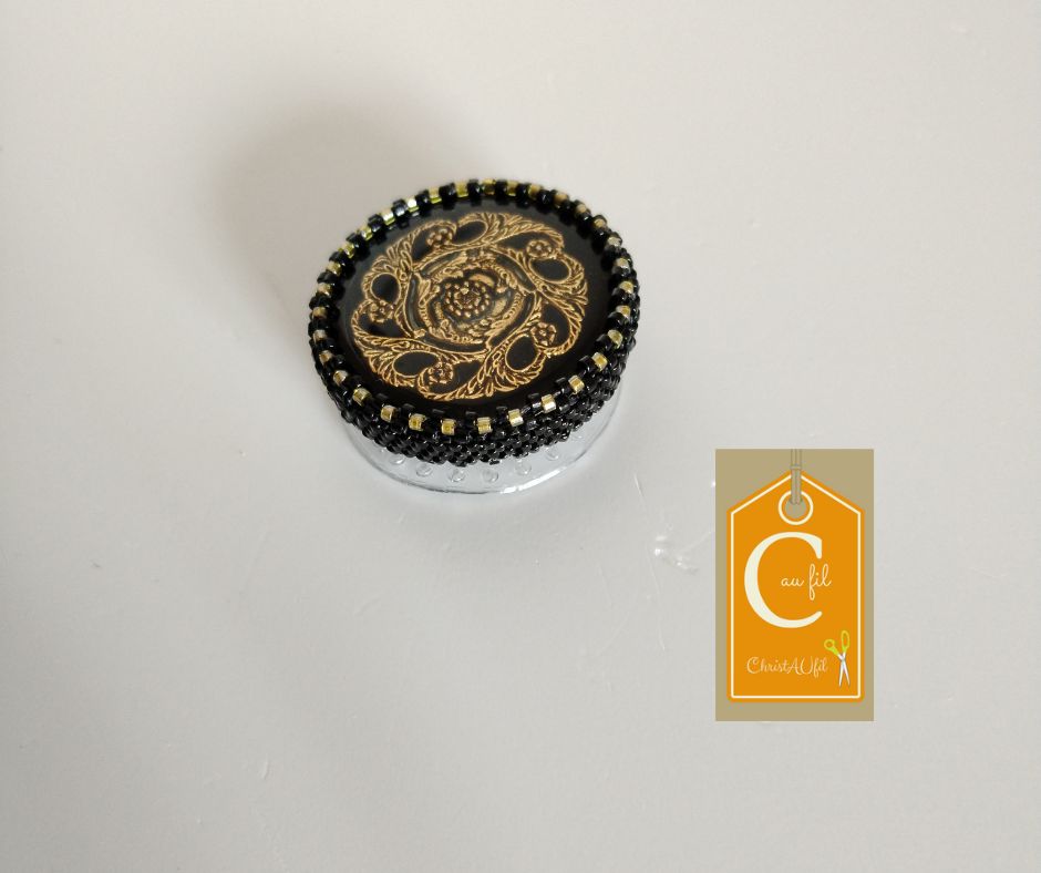Bouton ref 52105 noir à l’intérieur duquel il y a une rosace dorée. Diamètre du bouton 3,8 cm serti de perles japonaises noires. Cette broche entièrement réalisée à la main permet de fermer votre veste ou gilet ou encore une écharpe même épaisse sans percer votre vêtement grâce à un aimant néodyme placé à l’arrière.