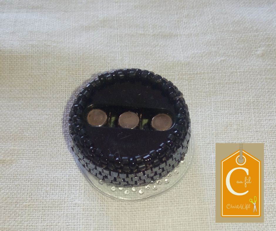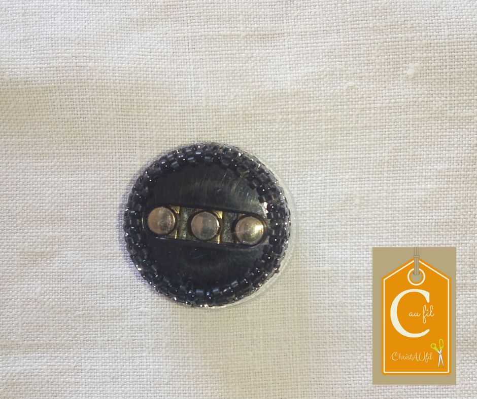 Bouton ref 52057 noir avec au centre 3 points métalliques. Diamètre du bouton 3 cm serti de perles japonaises noir métallisé en latéral et noires sur le dessus. Cette broche entièrement réalisée à la main permet de fermer votre veste ou gilet ou encore une écharpe même épaisse sans percer votre vêtement grâce à un aimant néodyme placé à l’arrière.