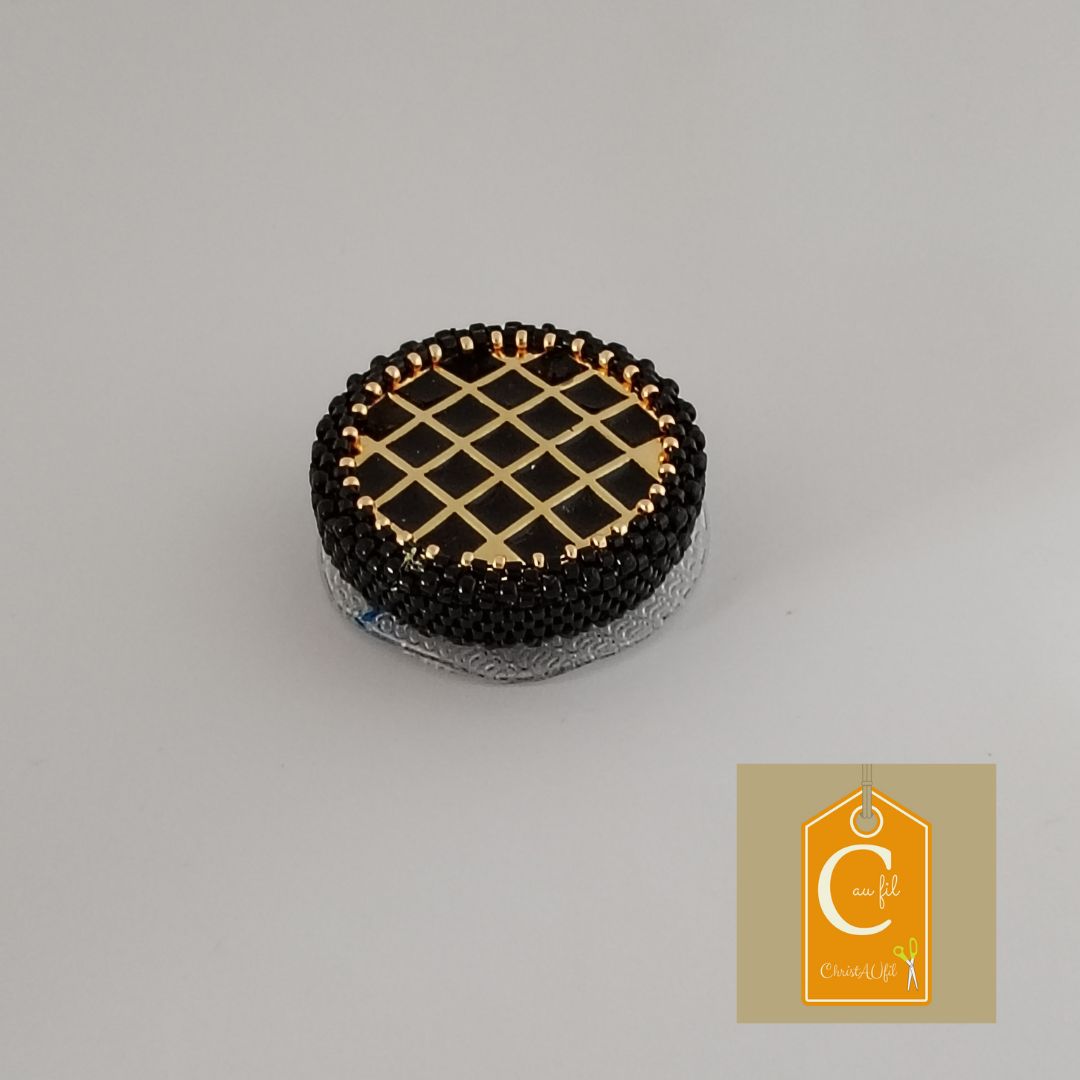 Bouton ref 52100 en noir avec un quadrillage doré. Diamètre du bouton 3,5 cm serti de perles japonaises noires. Cette broche entièrement réalisée à la main permet de fermer votre veste ou gilet ou encore une écharpe même épaisse sans percer votre vêtement grâce à un aimant néodyme placé à l’arrière.