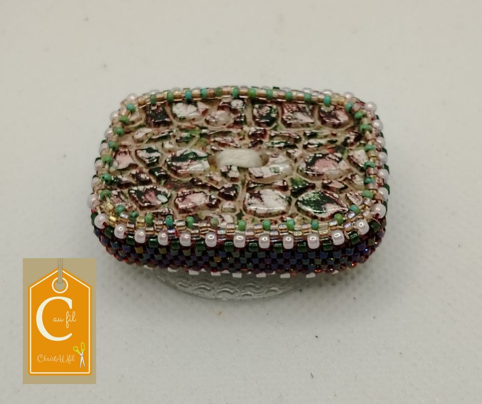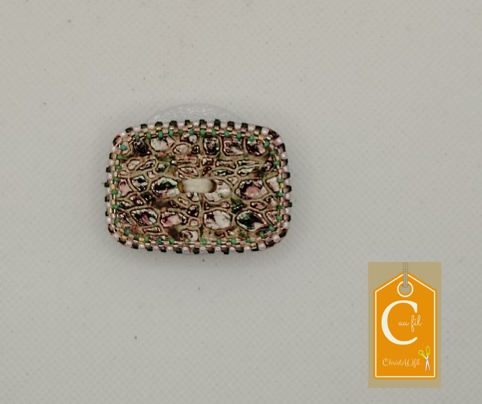 Bouton ref 55091 rectangulaire, moucheté vert, rose et blanc. Dimensions du bouton 4,2 cm x 3 cm serti de perles japonaises irisées bronze et quelques nuances vertes et blanches. Cette broche entièrement réalisée à la main permet de fermer votre veste ou gilet ou encore une écharpe même épaisse sans percer votre vêtement grâce à un aimant néodyme placé à l’arrière.