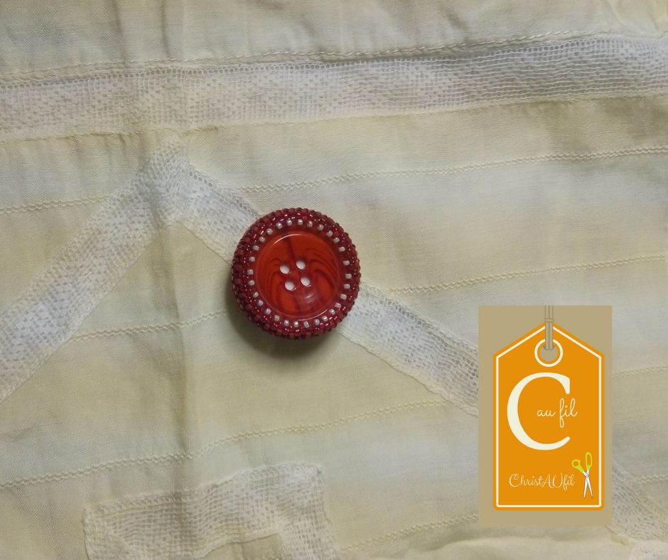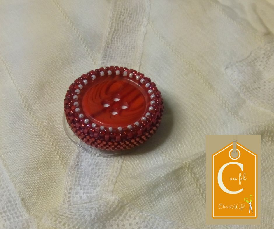Bouton ref 54037 rouge avec 4 trous sur fond blanc. Diamètre du bouton 3,2 cm serti de perles japonaises irisées rouges. Cette broche entièrement réalisée à la main permet de fermer votre veste ou gilet ou encore une écharpe même épaisse sans percer votre vêtement grâce à un aimant néodyme placé à l’arrière.
