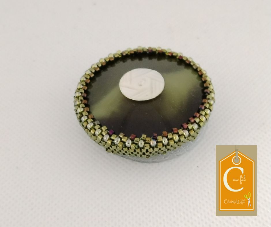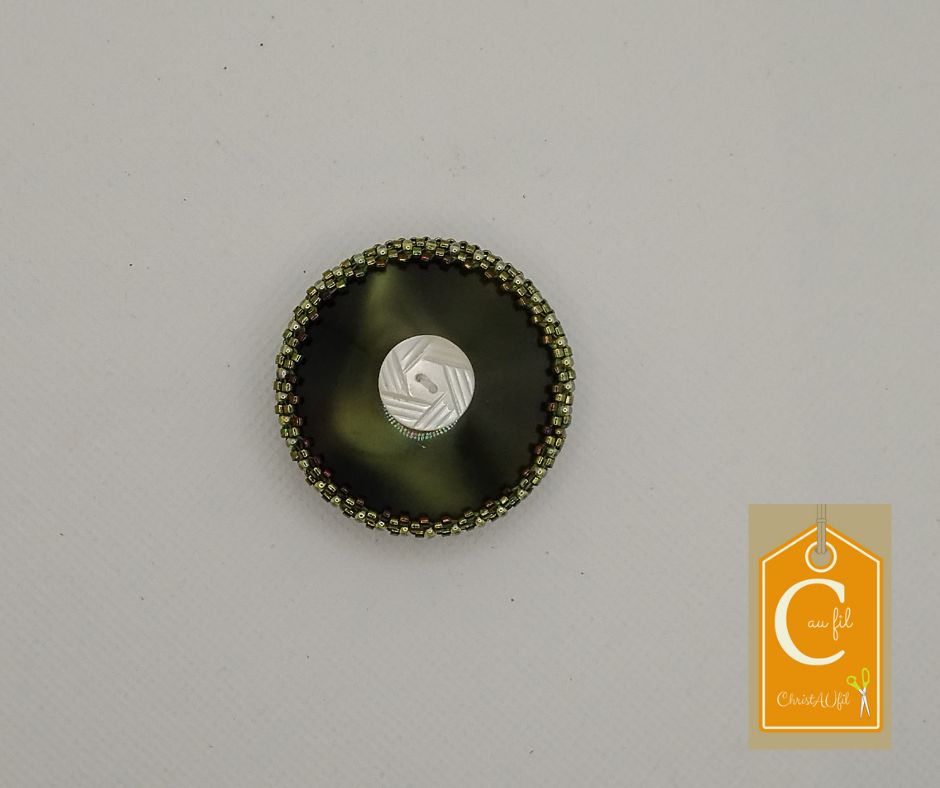 Bouton ref 55090 vert avec un petit bouton ancien blanc au centre. Diamètre du bouton 4,4 cm serti de perles japonaises vertes et quelques nuances bronze foncé. Cette broche entièrement réalisée à la main permet de fermer votre veste ou gilet ou encore une écharpe même épaisse sans percer votre vêtement grâce à un aimant néodyme placé à l’arrière.