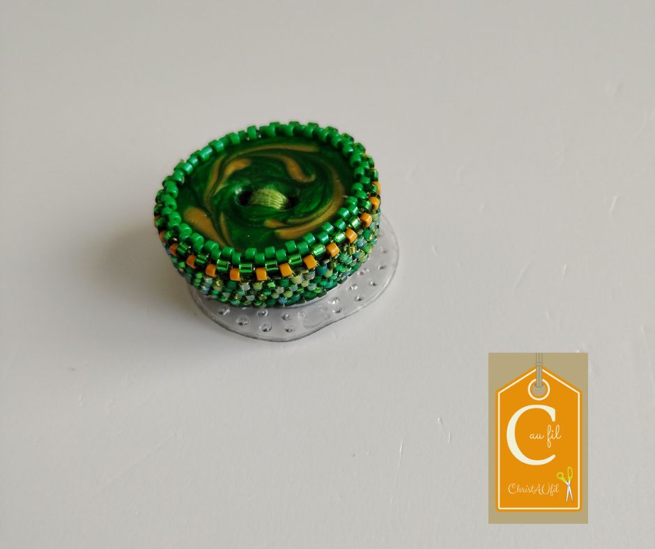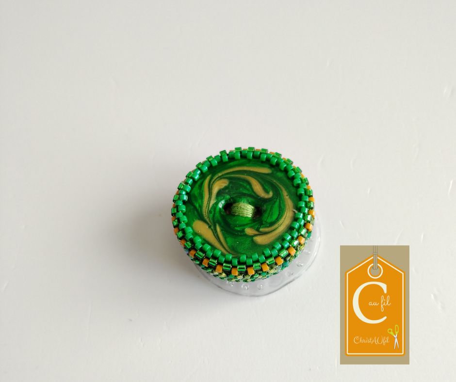 Bouton ref 55246 bouton vert et jaune émaillé. Diamètre du bouton 3,2 cm serti de perles japonaises vertes et jaunes. Cette broche entièrement réalisée à la main permet de fermer votre veste ou gilet ou encore une écharpe même épaisse sans percer votre vêtement grâce à un aimant néodyme placé à l’arrière.