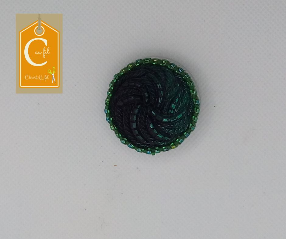 Bouton ref 55072 vert foncé avec un motif en relief. Diamètre du bouton 3,7 cm serti de perles japonaises irisées vertes. Cette broche entièrement réalisée à la main permet de fermer votre veste ou gilet ou encore une écharpe même épaisse sans percer votre vêtement grâce à un aimant néodyme placé à l’arrière.