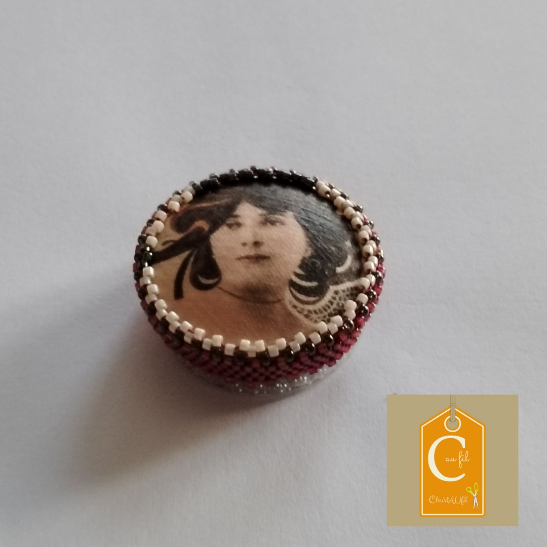 Bouton ref 54102 portrait de femme cheveux au vent. Diamètre du bouton 4 cm serti de perles japonaises irisées bordeaux rouge avec quelques notes blanches et grises. Cette broche entièrement réalisée à la main permet de fermer votre veste ou gilet ou encore une écharpe même épaisse sans percer votre vêtement grâce à un aimant néodyme placé à l’arrière.