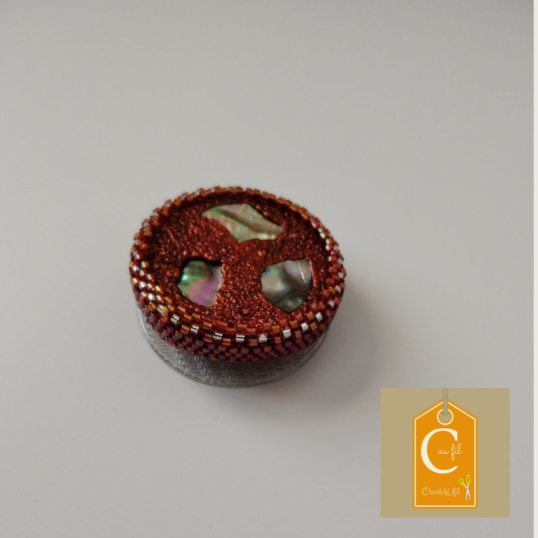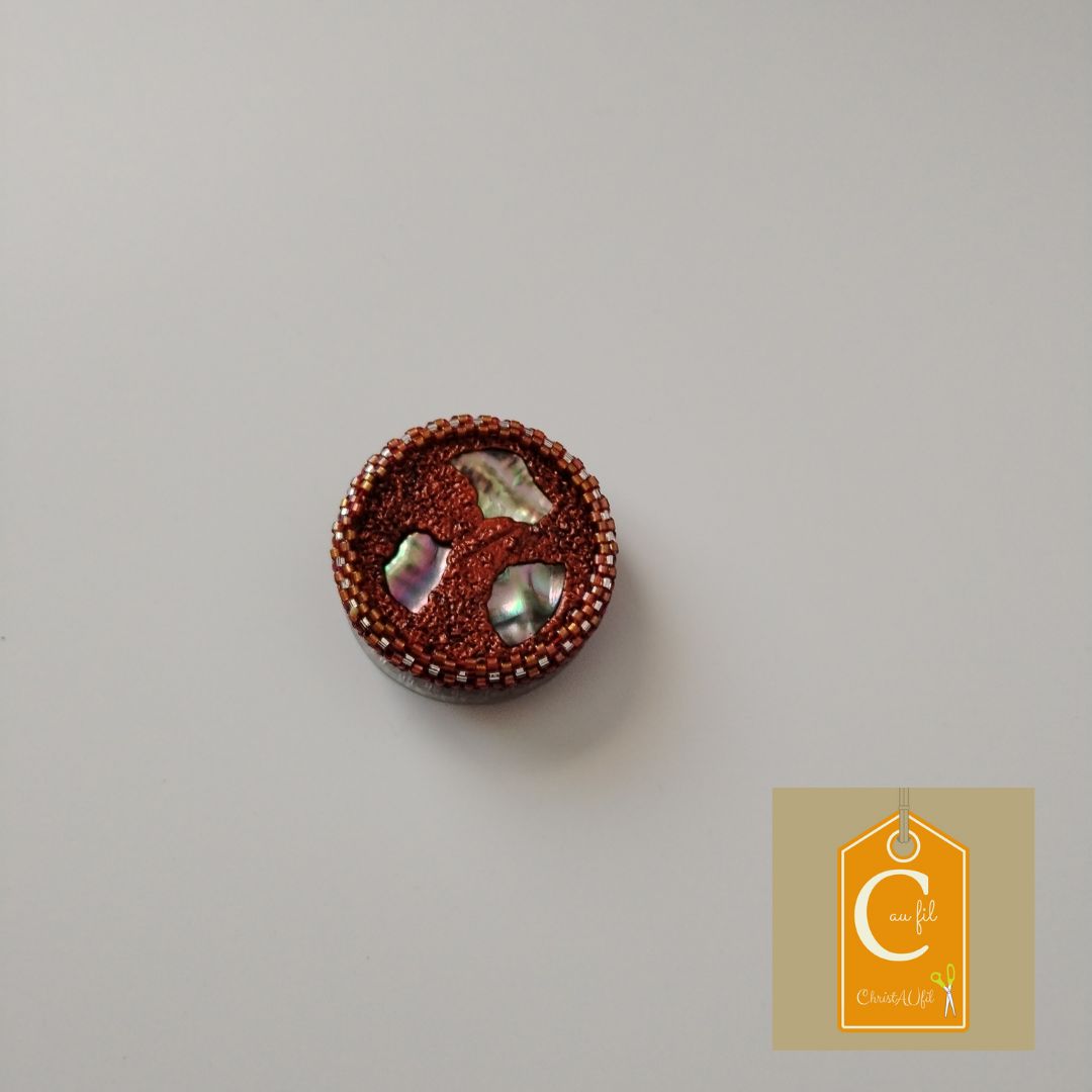 Bouton ref 56101 couleur terra cotta avec 3 incrustations de nacre. Diamètre du bouton 3,8 cm serti de perles japonaises irisées marron. Cette broche entièrement réalisée à la main permet de fermer votre veste ou gilet ou encore une écharpe même épaisse sans percer votre vêtement grâce à un aimant néodyme placé à l’arrière.