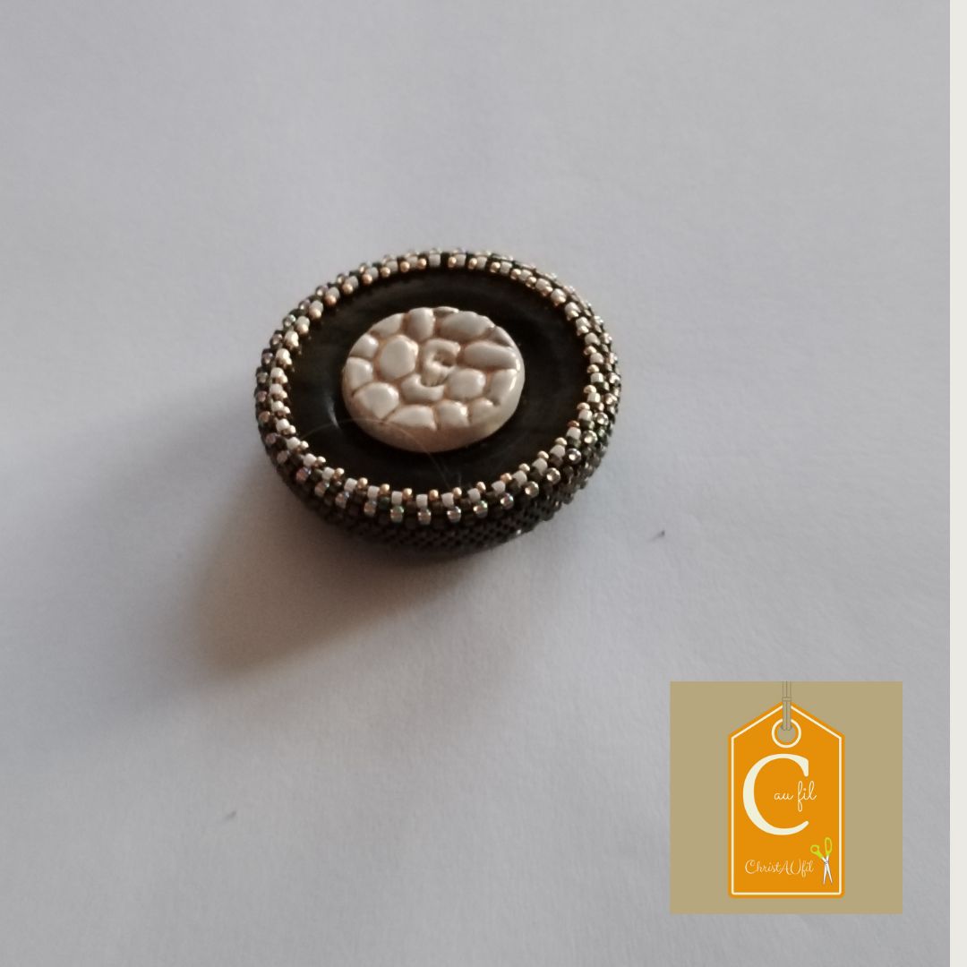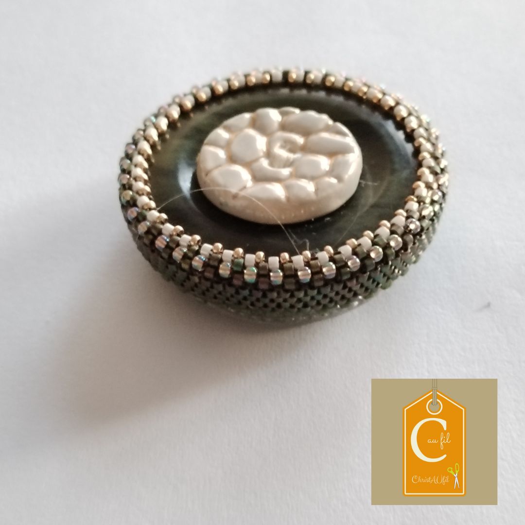Bouton ref 55099 verte avec au centre un plus petit bouton blanc en céramique. Diamètre du bouton 4,8 cm serti de perles japonaises irisées vertes avec quelques notes blanches et dorées. Cette broche entièrement réalisée à la main permet de fermer votre veste ou gilet ou encore une écharpe même épaisse sans percer votre vêtement grâce à un aimant néodyme placé à l’arrière.