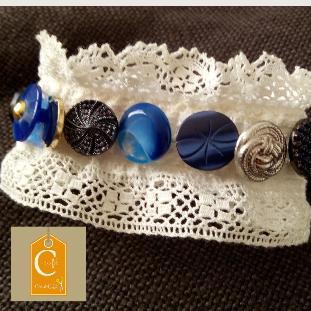 Cette manchette ref 71016 dentelle blanche et boutons à prédominance bleue apportera une touche de féminité, portée sur le revers de la manche de votre pull ou bien sur une veste en jean etc… Elle rappellera également les teintes de votre robe, de votre chemisier. La dentelle est montée sur un élastique.