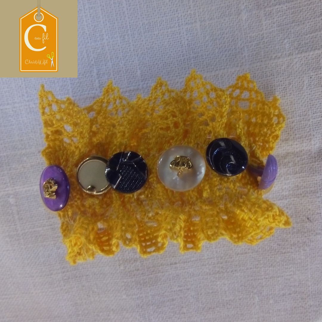 Soyez le premier à laisser votre avis sur “Manchette jaune, boutons mauves, blancs, noirs”