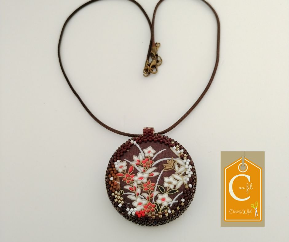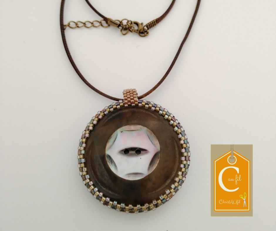 Bouton ref 15222 ancien vert kaki avec un centre incrusté en nacre. Diamètre 4,7 cm serti de perles japonaises irisées vertes et beige doré. A l’arrière, les perles sont marron, beiges, blanches, avec quelques touches de rouge. Le verso est agrémenté d’un joli papier japonais fleuri, avec vernis de protection. Pendentif entièrement fait main fourni avec un lien marron de longueur totale 42 cm + fermeture et extension chainette bronze lg 5 cm.