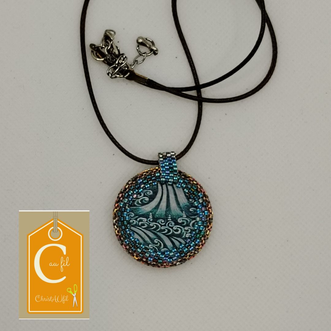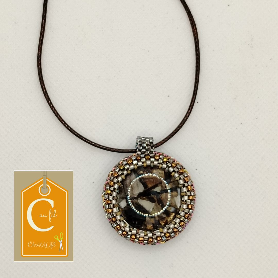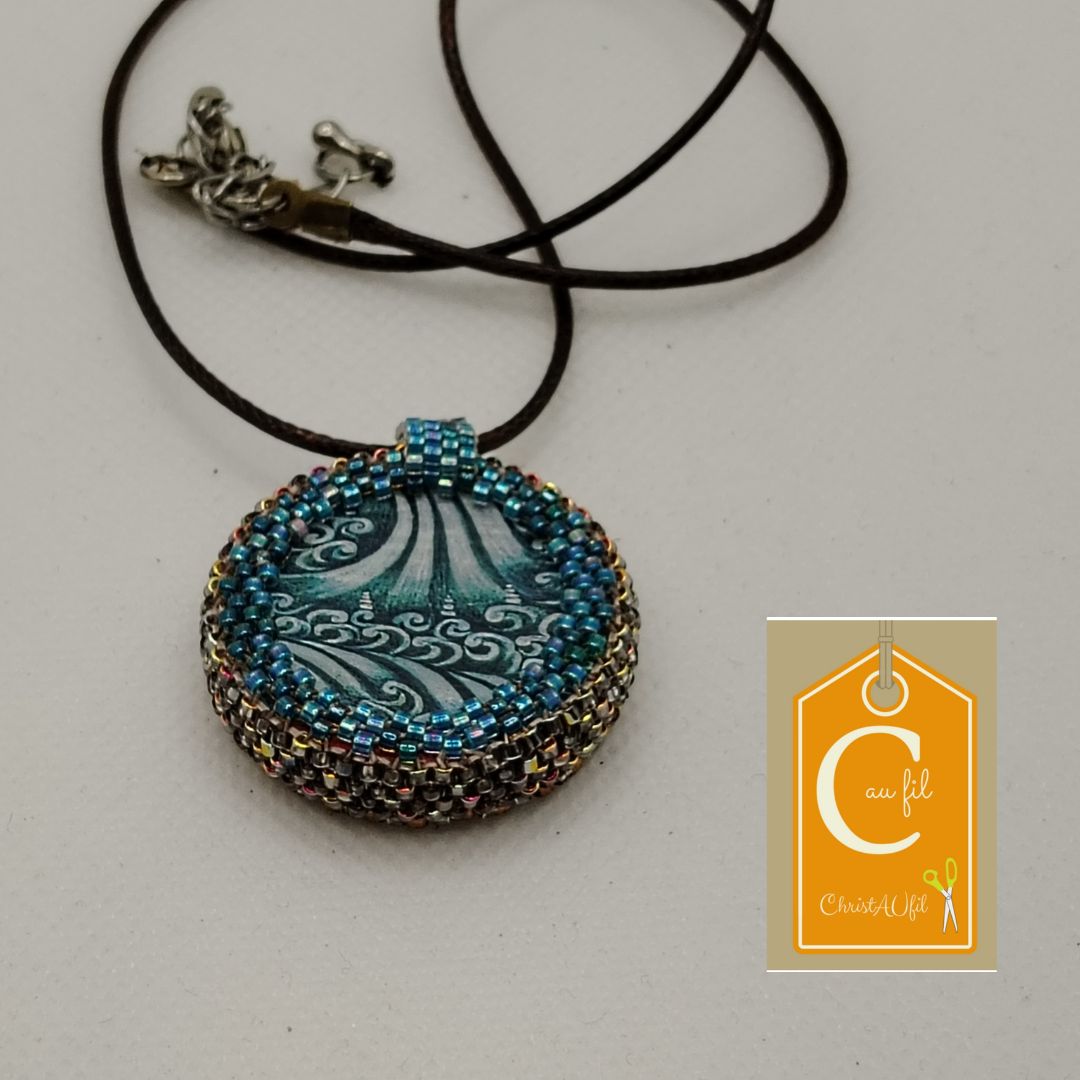 Bouton ref 17115 représentant des éclats de pierre de différentes couleurs en inclusion. Diamètre 3,2 cm serti de perles japonaises noires, irisées bleu gris, métal et bronze. Le verso est agrémenté d’un joli papier japonais bleu et blanc symbolisant une cascade d’eau, avec vernis de protection. Pendentif entièrement fait main fourni avec un lien marron foncé de longueur totale 40 cm avec fermeture et extension métallique lg 6 cm.