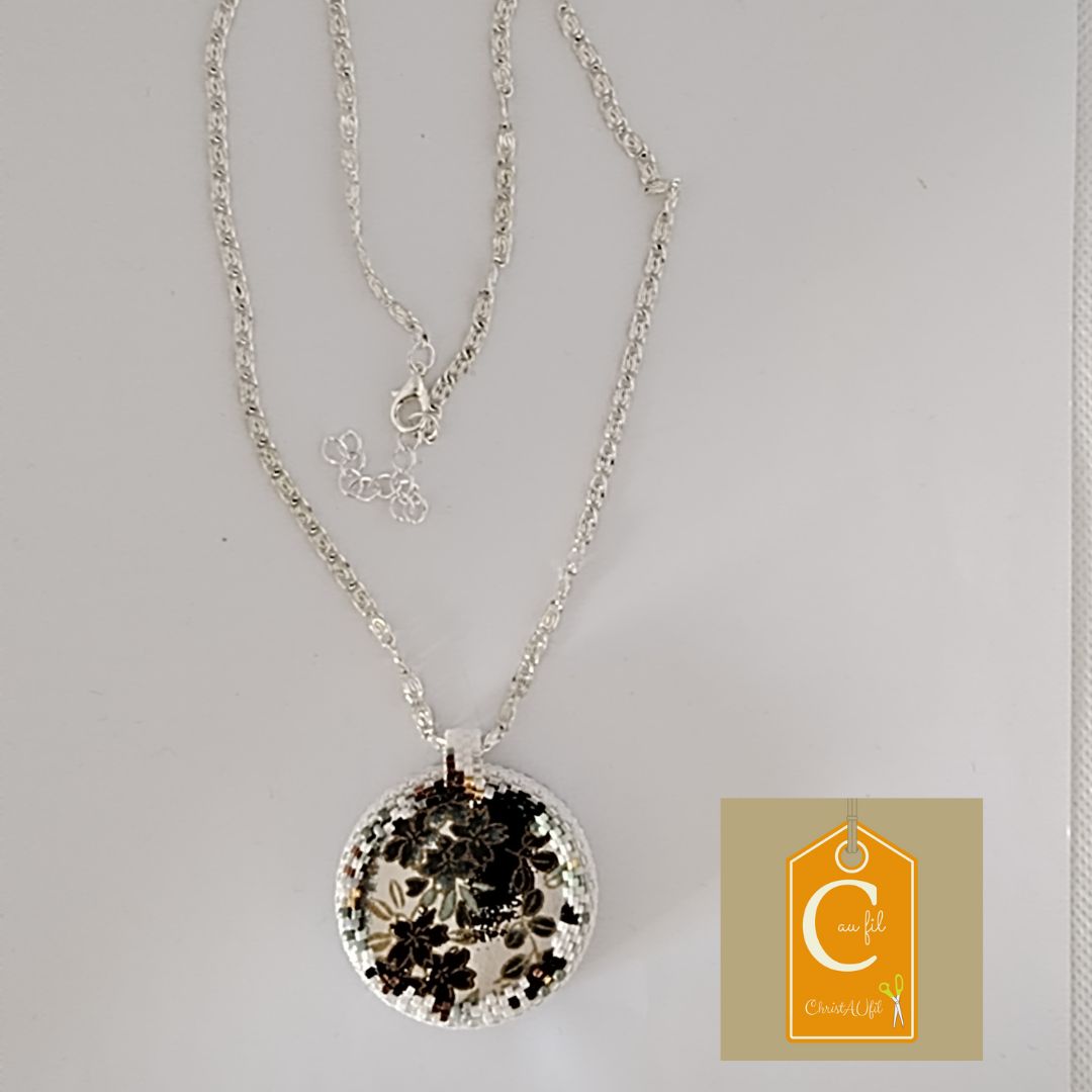 Bouton ref 11161 blanc avec à l’intérieur une forme de lune argentée. Diamètre 4,1 cm serti de perles japonaises blanches et argentées. A l’arrière, les perles sont noires et blanches avec quelques touches bronze. Le verso est agrémenté d’un joli papier japonais fleuri, avec vernis de protection. Pendentif entièrement fait main fourni avec une chaine de longueur totale 44 cm avec fermeture et extension chainette lg 5 cm.