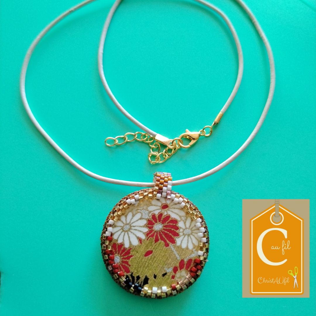 Bouton ref 11188 blanc avec au milieu un motif style art deco. Diamètre 3,8 cm serti de perles japonaises blanches et irisées sienne. A l’arrière, les perles sont bronze et blanches avec quelques touches de noir. Le verso est agrémenté d’un joli papier japonais fleuri avec vernis de protection. Pendentif entièrement fait main fourni avec un lien blanc de longueur totale 50 cm + fermeture et extension chainette dorée lg 5 cm.