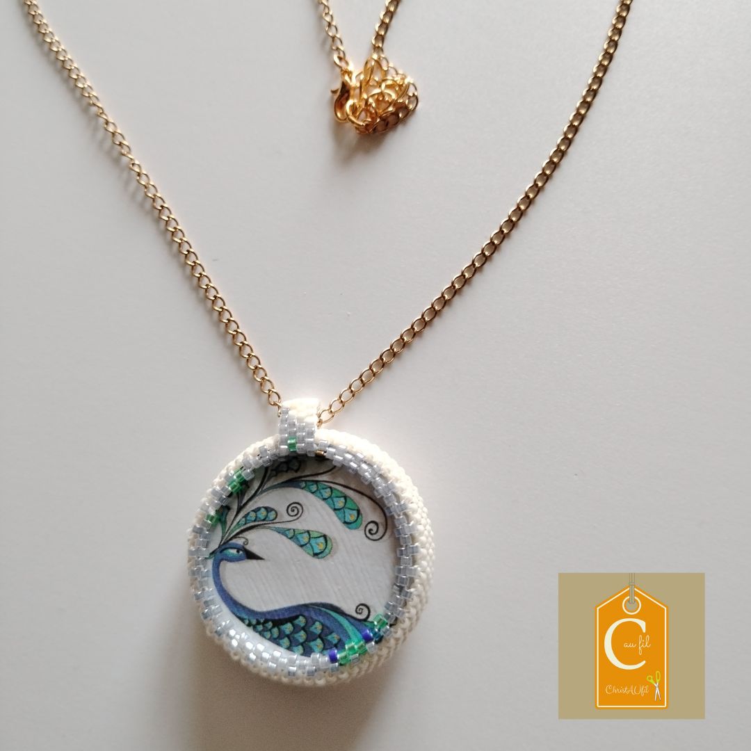 Bouton ref 11176 nacre blanche avec au centre un autre bouton, bleu avec motif style art deco. Diamètre 3,8 cm serti de perles japonaises blanches. A l’arrière, les perles sont bleues très clair avec quelques touches de bleu plus profond. Le verso est agrémenté d’un joli papier représentant un paon, avec vernis de protection. Pendentif entièrement fait main fourni avec une chaine de longueur totale 52 cm + fermeture et extension chainette dorée lg 5 cm.