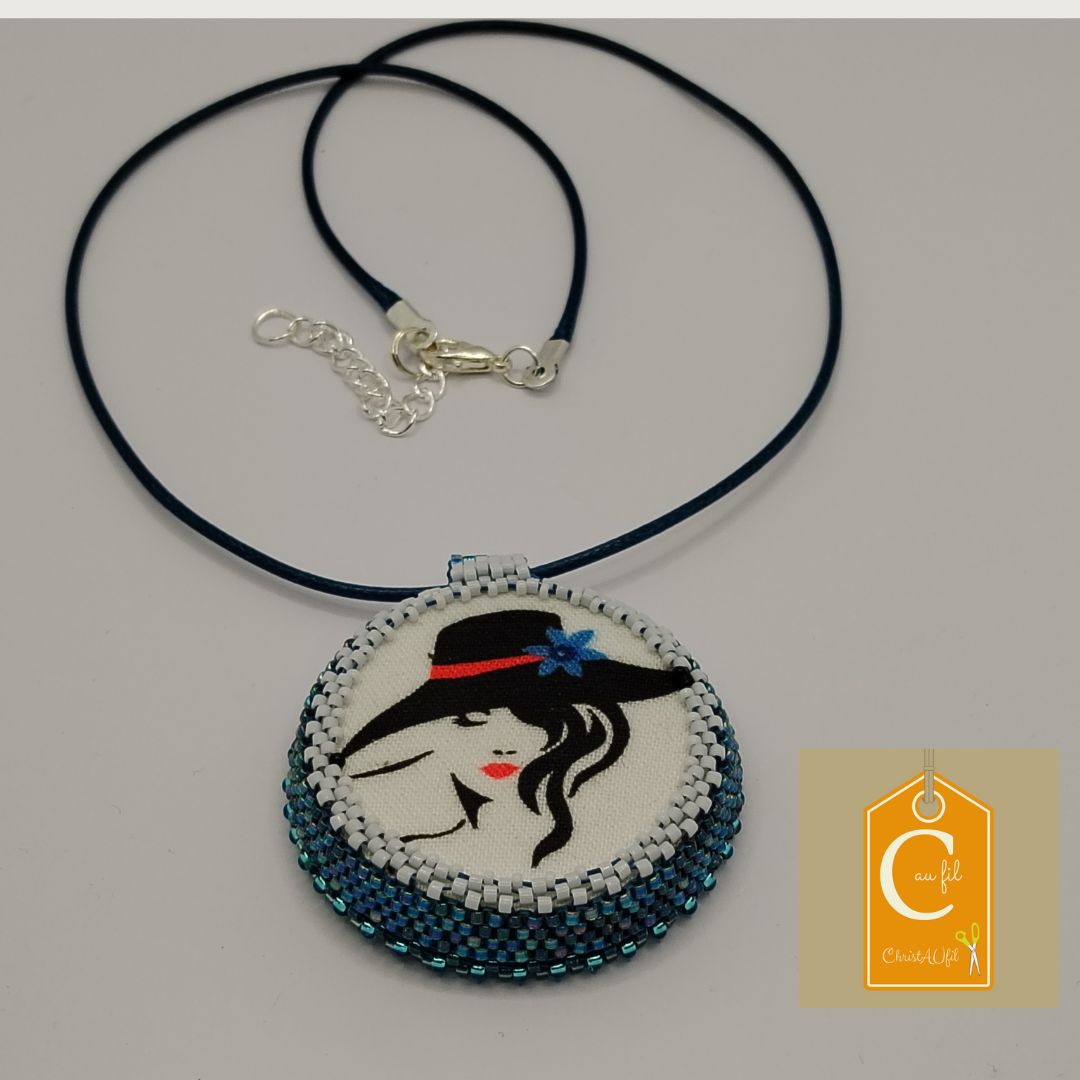 Bouton ref 13155 bleu avec 3 trous au milieu. Diamètre 4,6 cm serti de perles japonaises irisées bleues. A l’arrière, les perles sont blanches. Le verso est agrémenté d’un tissu représentant un portrait de femme, avec vernis de protection. Pendentif entièrement fait main fourni avec un lien bleu de longueur totale 42 cm avec fermeture et extension chainette lg 5 cm.
