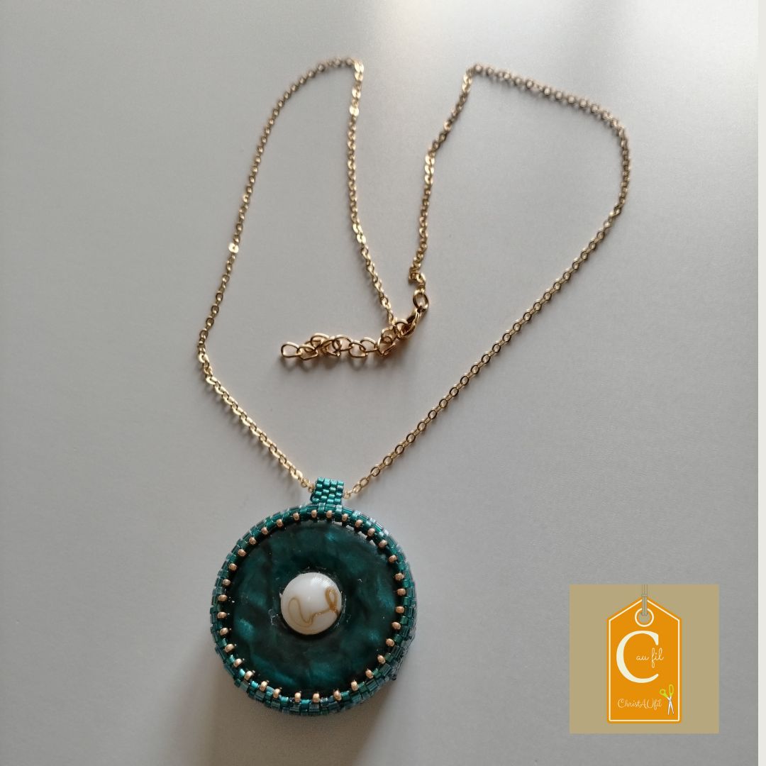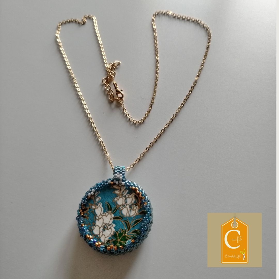 Bouton ref 13177 irisé bleu avec au centre un plus petit bouton de couleur blanche. Diamètre 3,6 cm serti de perles japonaises irisées bleues et bronze. A l’arrière, les perles sont bleues et dorées avec quelques touches de blanc. Le verso est agrémenté d’un joli papier japonais fleuri avec vernis de protection. Pendentif entièrement fait main fourni avec une chainette de longueur totale 53cm + fermeture et extension chainette dorée lg 5 cm.