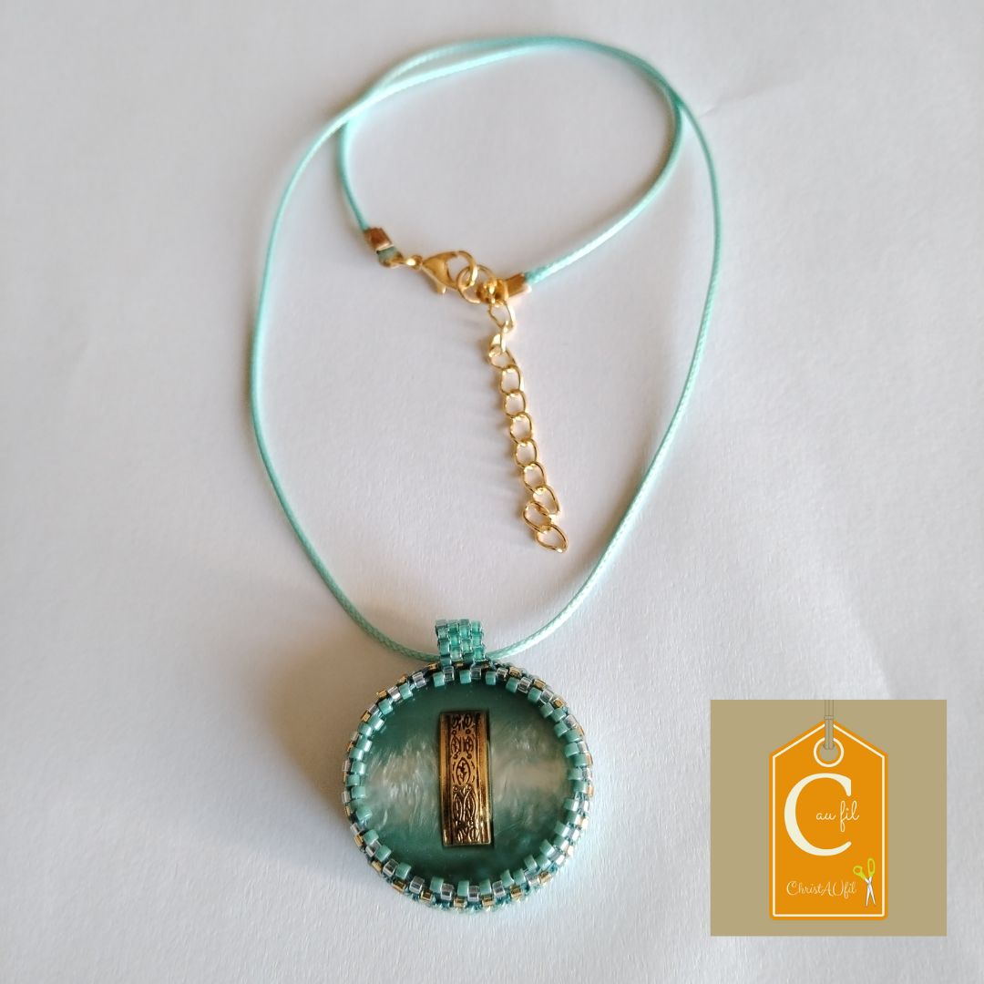 Bouton ref 13160 bleu ciel avec une insertion dorée au milieu. Diamètre 3 cm serti de perles japonaises irisées bleues. A l’arrière, les perles sont bleues avec quelques touches roses. Le verso est agrémenté d’un joli papier , bouquet de fleurs sur fond bleu clair, avec vernis de protection. Pendentif entièrement fait main fourni avec un lien bleu de longueur totale 42 cm avec fermeture et extension chainette dorée lg 5 cm.