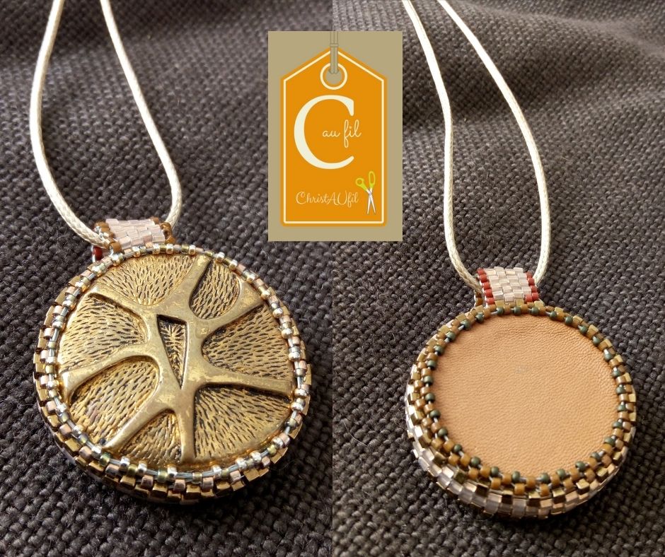 Bouton ref 18020 de couleur bronze, diamètre 3,6 cm serti de perles japonaises bronzes et rose très pâle. Le verso est en cuir. Pendentif entièrement fait main fourni avec un lien de longueur totale 46 cm avec fermeture et chaînette lg 4 cm.