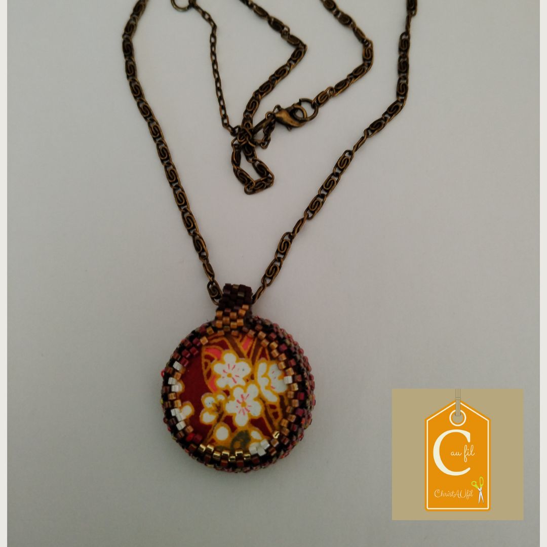 Bouton ancien ref 16140 brun, le motif est une fleur tressée en forme de couronne. Diamètre 3 cm serti de perles japonaises irisées brunes. A l’arrière, les perles sont dorées, blanches avec quelques touches de rouge. Le verso est agrémenté d’un joli papier japonais fleuri, avec vernis de protection. Pendentif entièrement fait main fourni avec une chainette bronze de longueur totale 42 cm avec fermeture et extension chainette lg 7 cm.