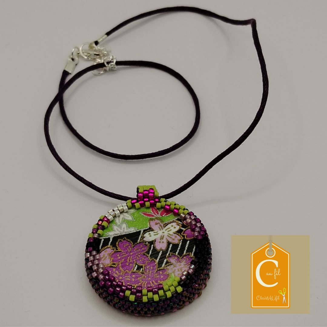 Bouton céramique ref 14157 motif fleuri. Diamètre 3,7 cm serti de perles japonaises irisées mauves. A l’arrière, les perles sont mauves, noires, blanches et quelques touches fuchsia. Le verso est agrémenté d’un joli papier japonais fleuri, avec vernis de protection. Pendentif entièrement fait main fourni avec un lien mauve de longueur totale 40 cm avec fermeture et extension chainette lg 5 cm.