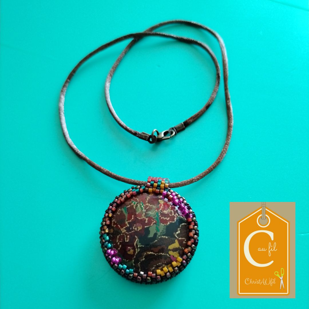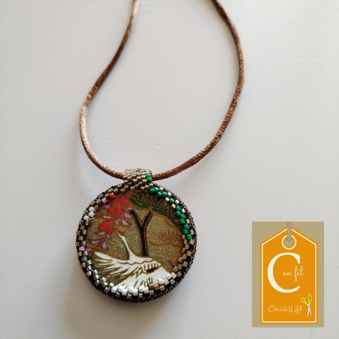 Bouton ref 16190 chamarré ou multicolore. Diamètre 3,6 cm serti de perles japonaises irisées vert bronze. A l’arrière, les perles sont bronze, vertes, blanches avec quelques touches de rose. Le verso est agrémenté d’un joli papier japonais représentant la grue porte bonheur, avec vernis de protection. Pendentif entièrement fait main fourni avec un lien brun de longueur totale 44 cm + fermeture et extension chainette lg 5 cm.