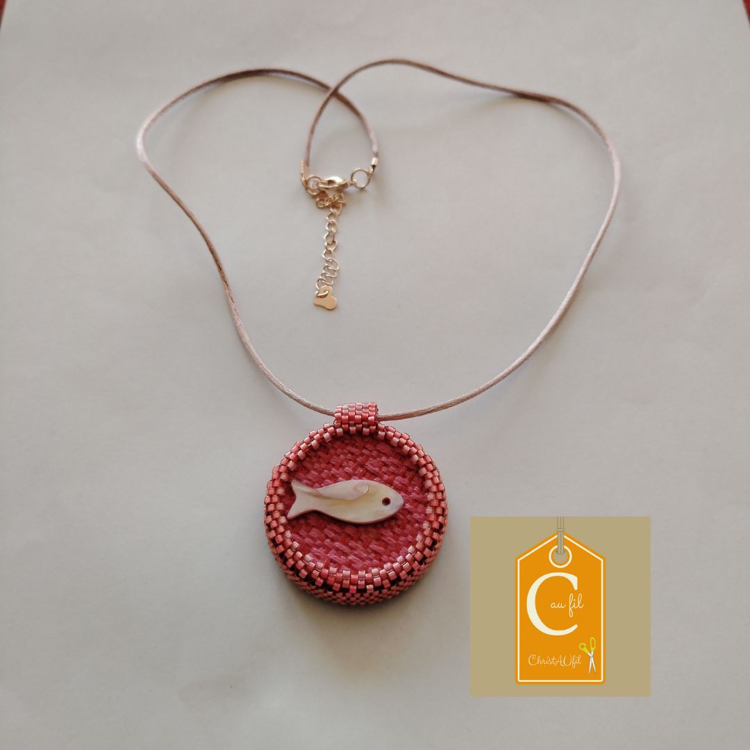 Bouton moderne ref 14148 orangé rouge. Diamètre 3,6 cm serti de perles japonaises irisées roses avec des touches de couleur bleue, noires et jaunes. Le verso est agrémenté d’un poisson en nacre rose et des perles roses. Pendentif entièrement fait main fourni avec un lien rose pâle de longueur totale 40 cm avec fermeture et extension chainette lg 6 cm.
