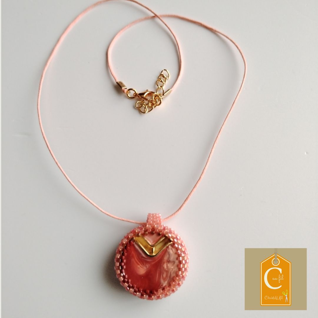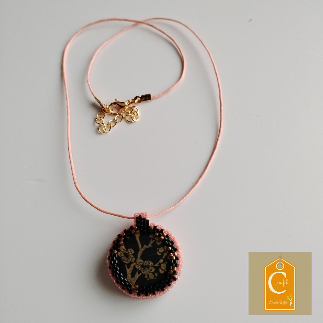 Bouton ref 14175 irisé rose orangé, aspect nacré avec un motif en métal doré en haut . Diamètre 3 cm serti de perles japonaises irisées roses. A l’arrière, les perles sont noires avec quelques touches de bronze. Le verso est agrémenté d’un joli papier japonais représentant des fleurs couleur bronze sur fond noir, avec vernis de protection. Pendentif entièrement fait main fourni avec un lien rose de longueur totale 42 cm + fermeture et extension chainette dorée lg 5 cm.