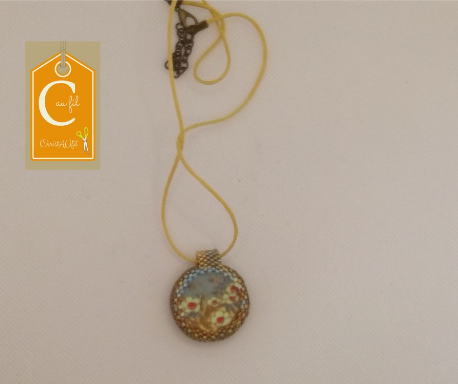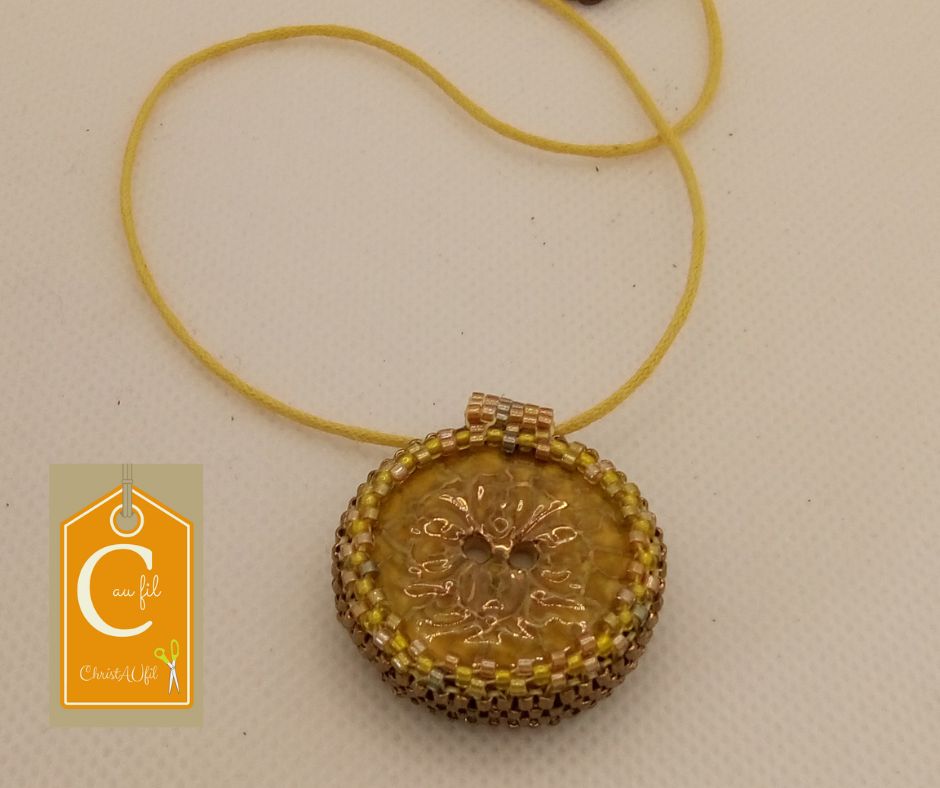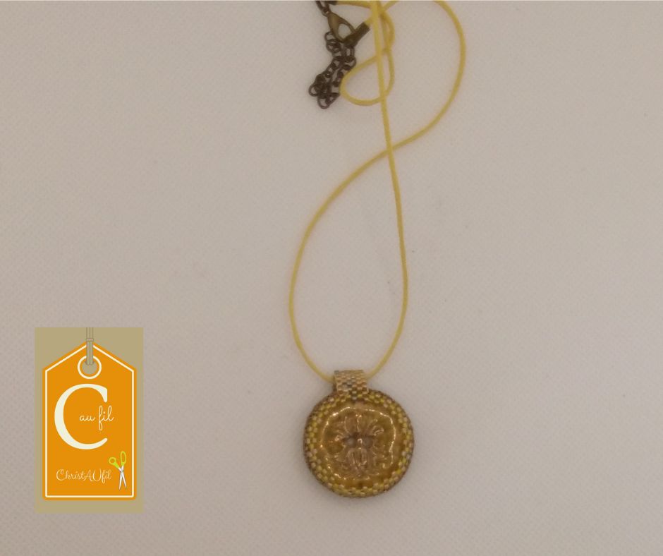 Bouton ref 18107 jaune en céramique. Diamètre 2,7 cm serti de perles japonaises irisées jaunes. Le verso est agrémenté d’un papier japonais représentant des fleurs, avec vernis de protection. Pendentif entièrement fait main fourni avec un lien jaune de longueur totale 39 cm avec fermeture et extension bronze lg 5 cm.