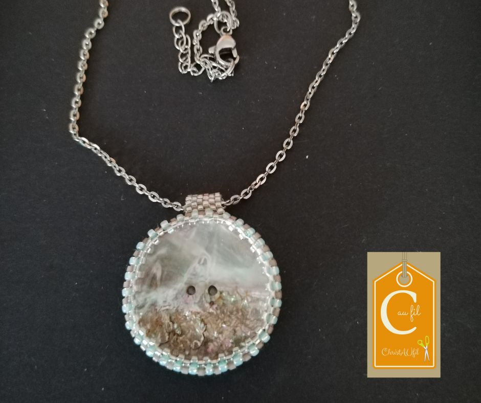 Bouton ref 13223 en nacre bleutée. Diamètre 3,5 cm serti de perles japonaises beige et bleu. A l’arrière, les perles sont blanches, beige. Le verso est agrémenté d’une dentelle, avec vernis de protection. Pendentif entièrement fait main fourni avec une chainette argentée de longueur totale 40 cm + fermeture et extension chainette argentée lg 5 cm.