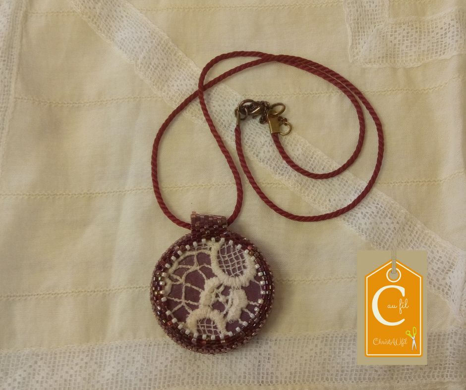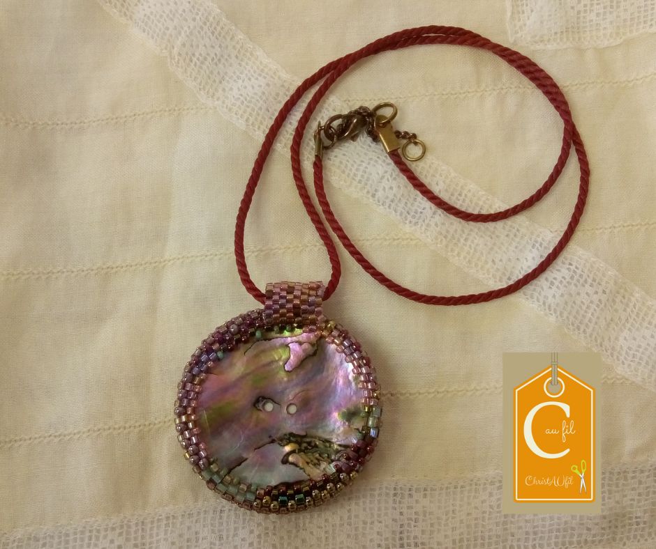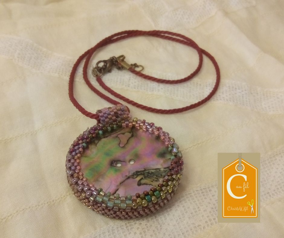 Bouton ref 14088 nacre irisé teintes roses, vertes. Diamètre 4 cm serti de perles japonaises irisées vieux rose, quelques notes de vert et blanc. Le verso est agrémenté d’une dentelle ancienne sur fond rouge foncé. Pendentif entièrement fait main fourni avec un lien de longueur totale 43 cm avec fermeture et chaînette bronze lg 3 cm.