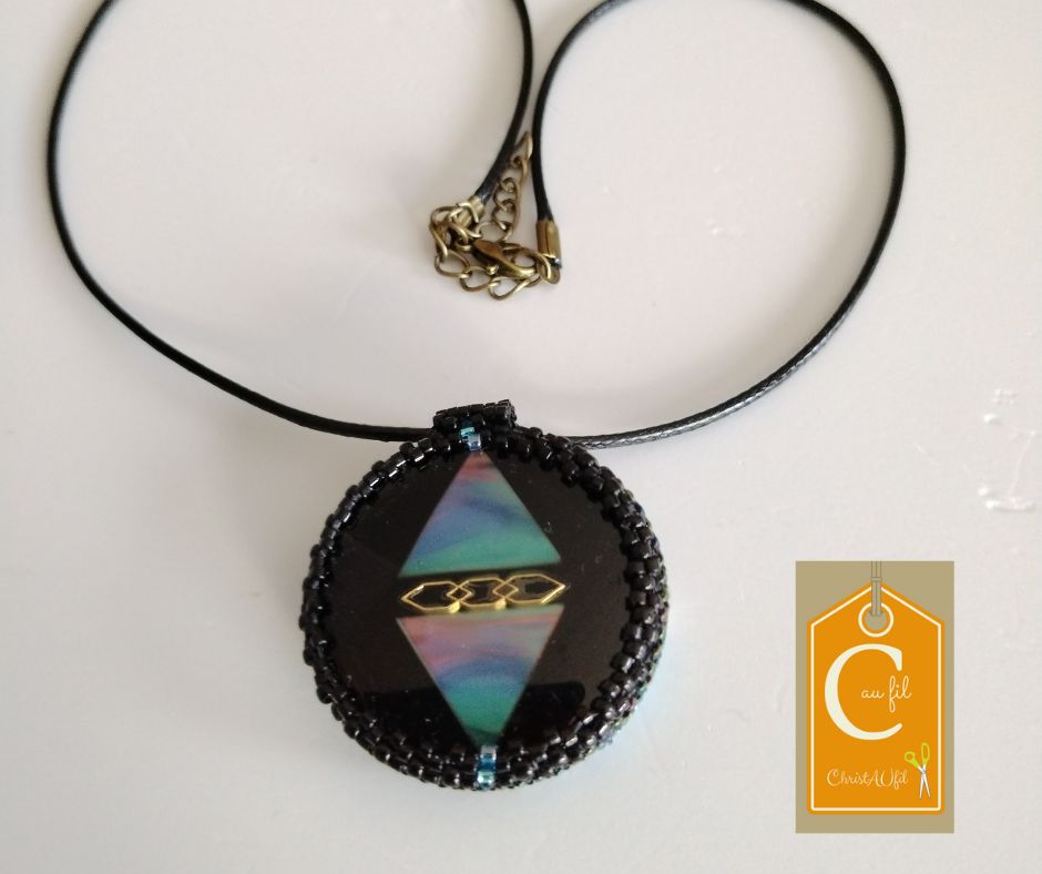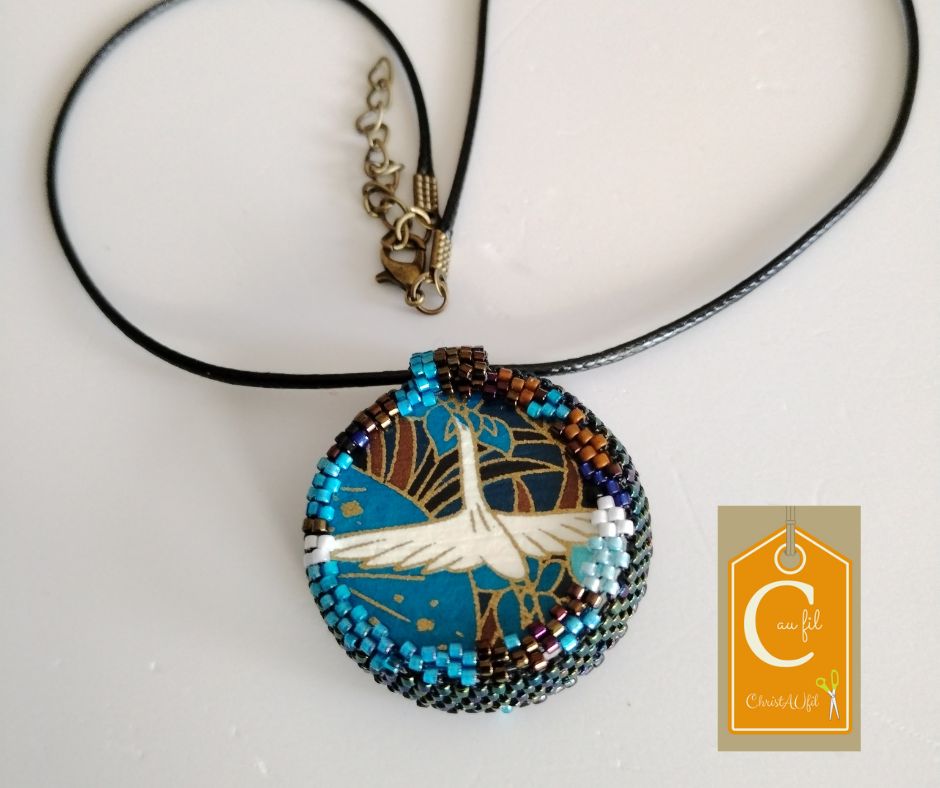 Bouton ref 12210 noir avec un losange irisé bleu. Diamètre 3,8 cm serti de perles japonaises irisées bleu foncé et noires. A l’arrière, les perles sont bleues, noires, marrons avec quelques touches de blanc. Le verso est agrémenté d’un joli papier japonais représentant la grue porte bonheur, avec vernis de protection. Pendentif entièrement fait main fourni avec un lien noir de longueur totale 42 cm + fermeture et extension chainette bronze lg 5 cm.
