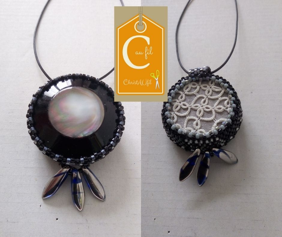 Bouton ref 12050 noir, ancien, avec au centre une partie nacrée. Diamètre 2,5 cm serti de perles japonaises noires. Dans le bas, 3 perles irisées noires en forme de gouttes. Le verso est agrémenté d’une dentelle résille blanche. Pendentif entièrement fait main fourni avec un lien de couleur noire avec fermeture et chaînette lg 5 cm. Modèle unique