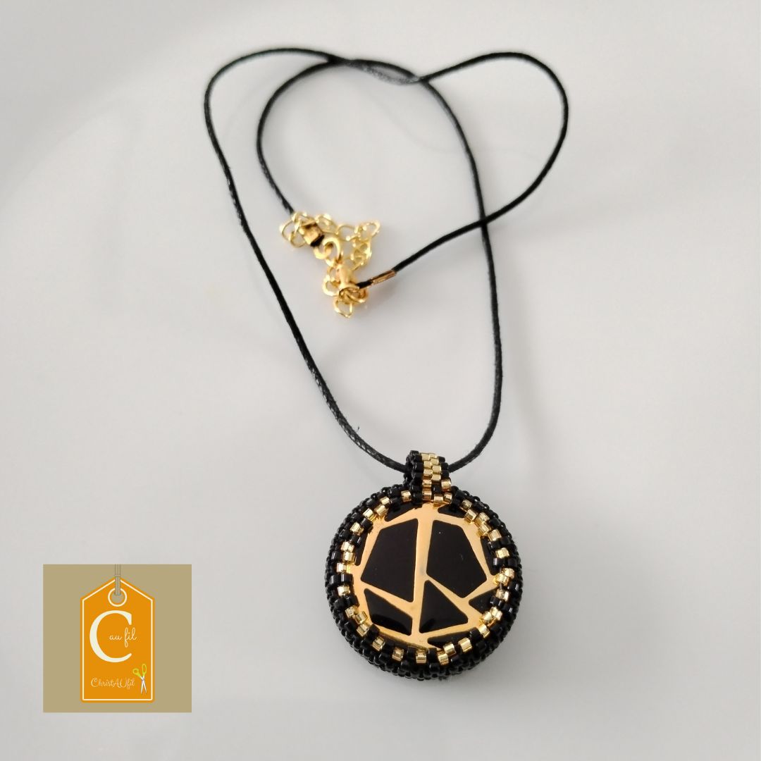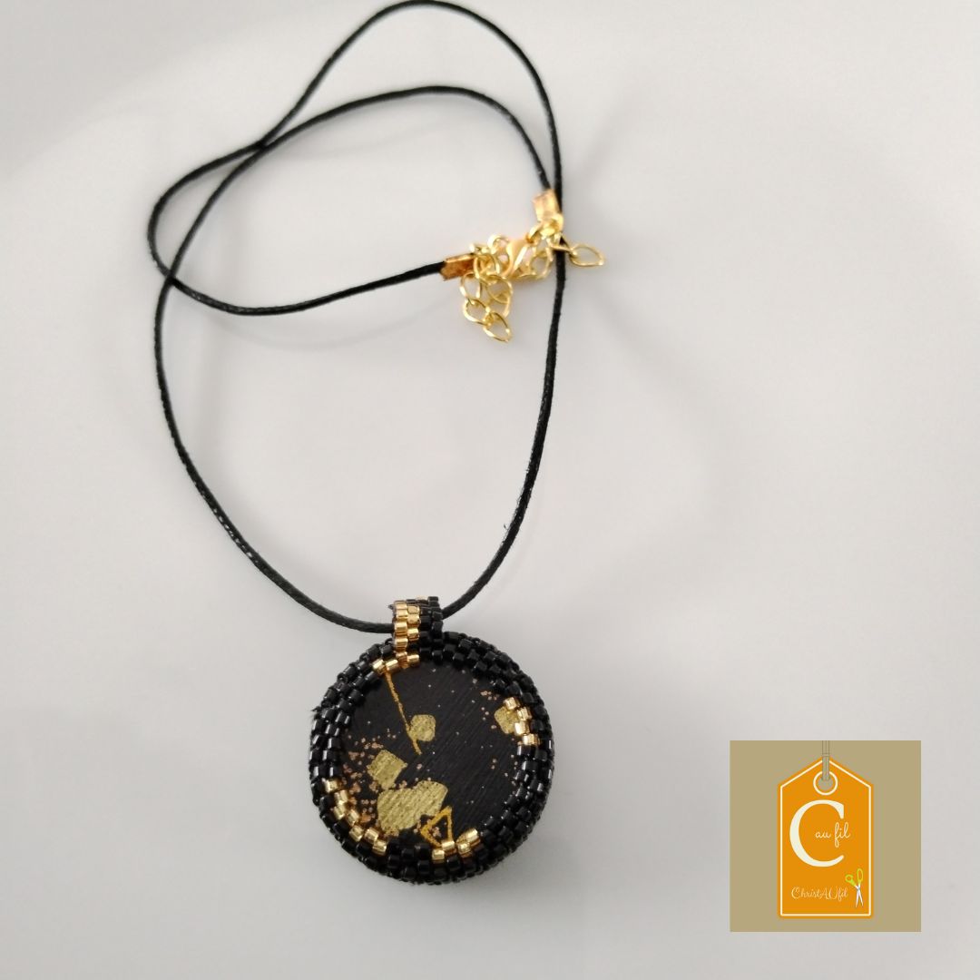 Bouton ref 12200 noir avec des lignes graphiques dorées. Diamètre 2,8 cm serti de perles japonaises noires et dorées. A l’arrière, les perles sont noires et dorées. Le verso est agrémenté d’un joli papier japonais avec vernis de protection. Pendentif entièrement fait main fourni avec un lien noir de longueur totale 38 cm + fermeture et extension chainette dorée lg 5 cm.