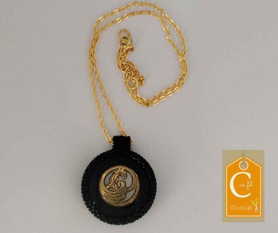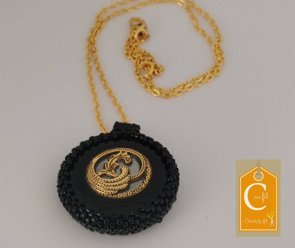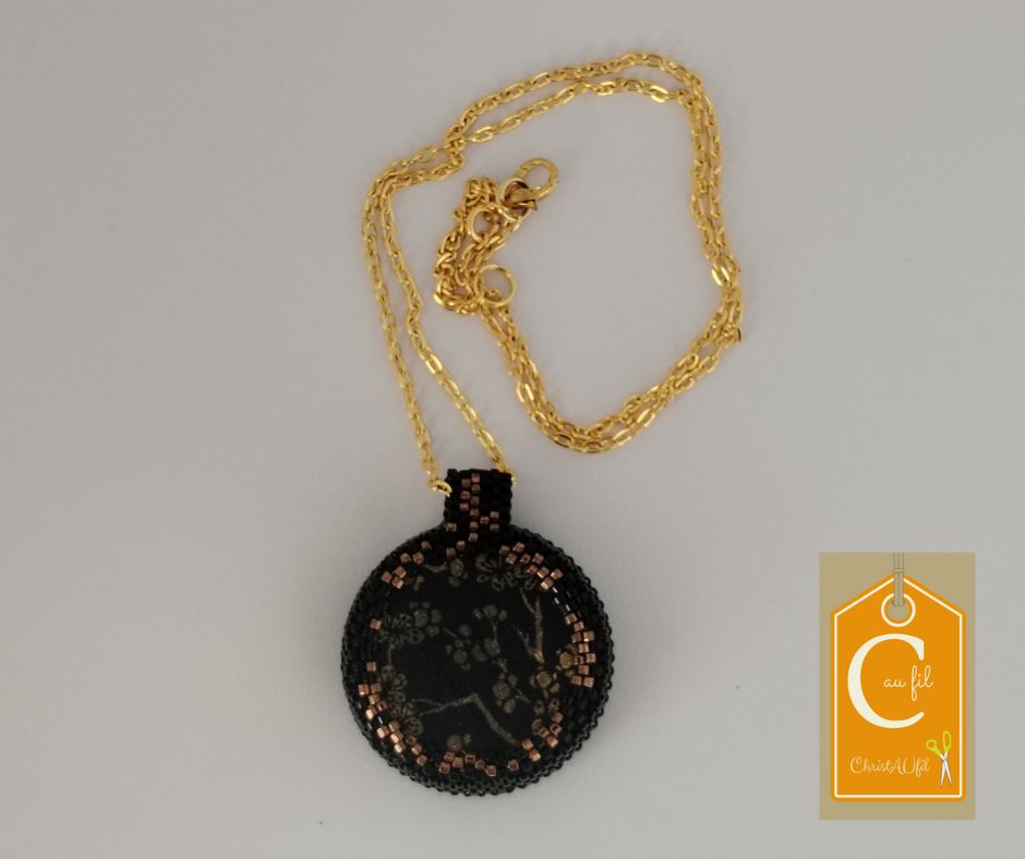 Bouton ref 12136 noir avec une insertion dorée. Diamètre 3,8 cm serti de perles japonaises noires et bronze. Le verso est agrémenté d’un joli papier japonais fleuri dans des teintes noires et or avec vernis de protection. Pendentif entièrement fait main fourni avec une chaine de longueur totale 42 cm avec fermeture et extension chainette lg 5 cm.