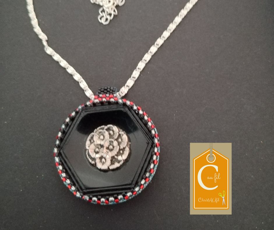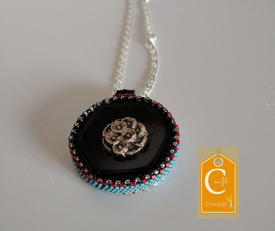Bouton ref 12224 noir ancien avec au centre un plus petit bouton argenté. Diamètre 4,5 cm serti de perles japonaises bleues, rouge et argentées. A l’arrière, les perles sont bleues, dorées, avec quelques touches de rouge et de blanc. Le verso est agrémenté d’un joli papier japonais fleuri, avec vernis de protection. Pendentif entièrement fait main fourni avec une chaine argentée de longueur totale 44 cm + fermeture et extension chainette argentée lg 5 cm.