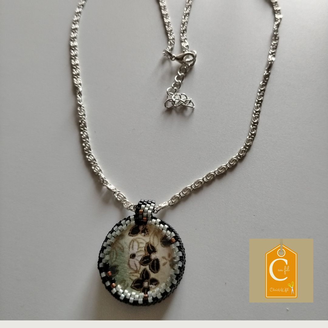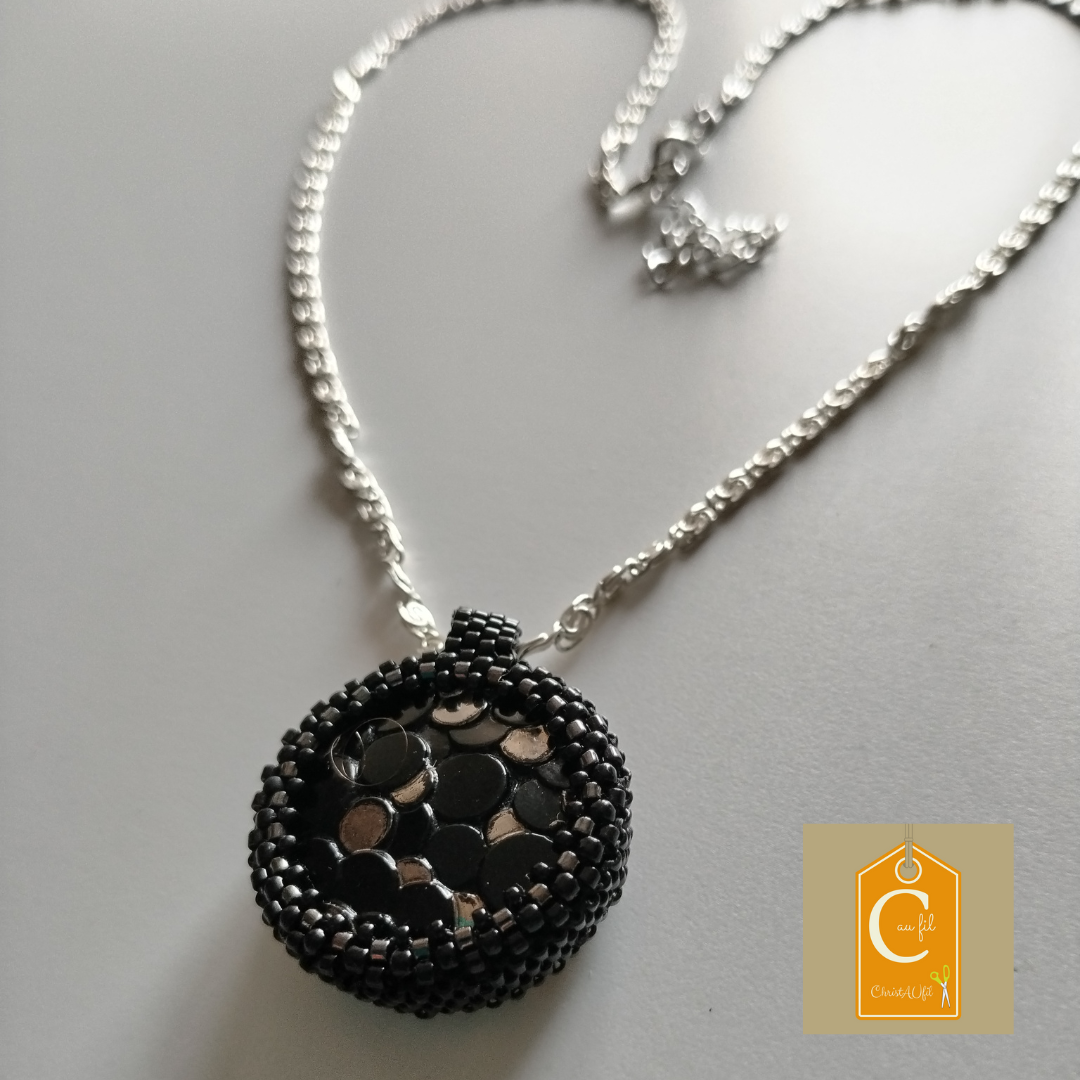 Bouton ref 12180 noir avec des pastilles noires et d’autres métalliques. Diamètre 3 cm serti de perles japonaises noires. A l’arrière, les perles sont vert d’eau avec quelques touches de bronze. Le verso est agrémenté d’un joli papier japonais, avec vernis de protection. Pendentif entièrement fait main fourni avec une chainette de longueur totale 50 cm + fermeture et extension chainette lg 5 cm.